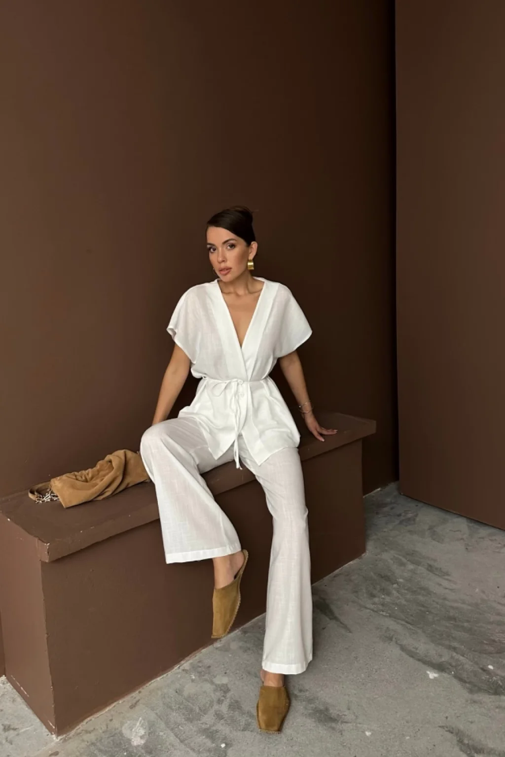 KETEN V YAKA BELDEN BAĞLAMALI BLUZ-PANTOLON TAKIM - Beyaz