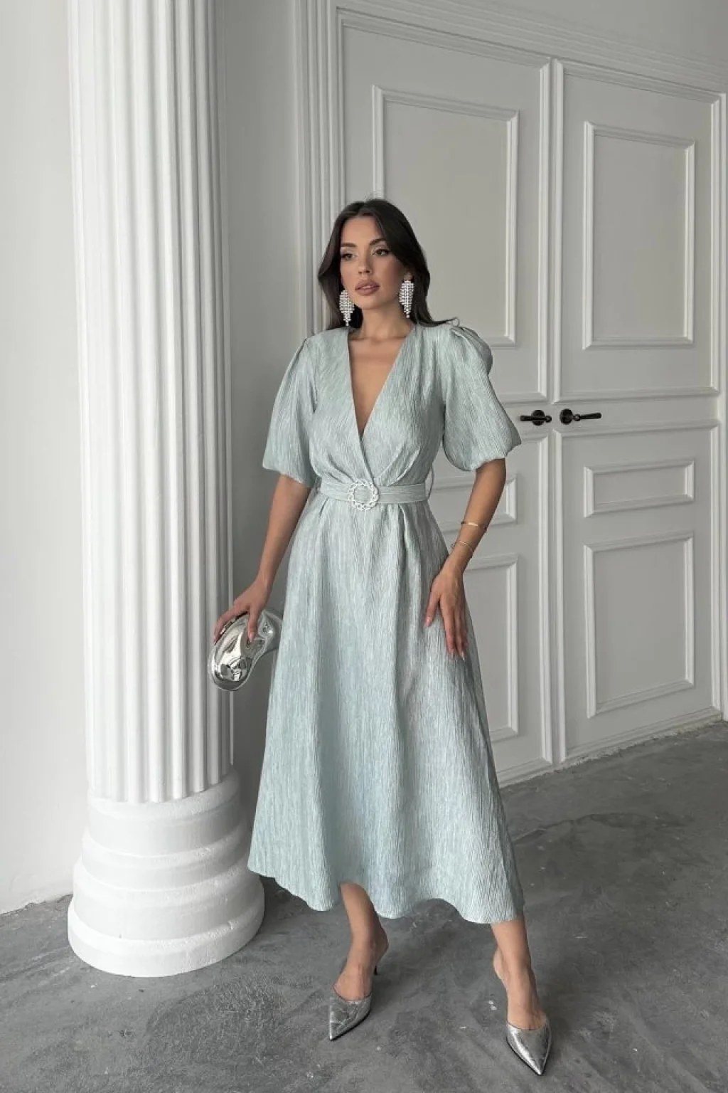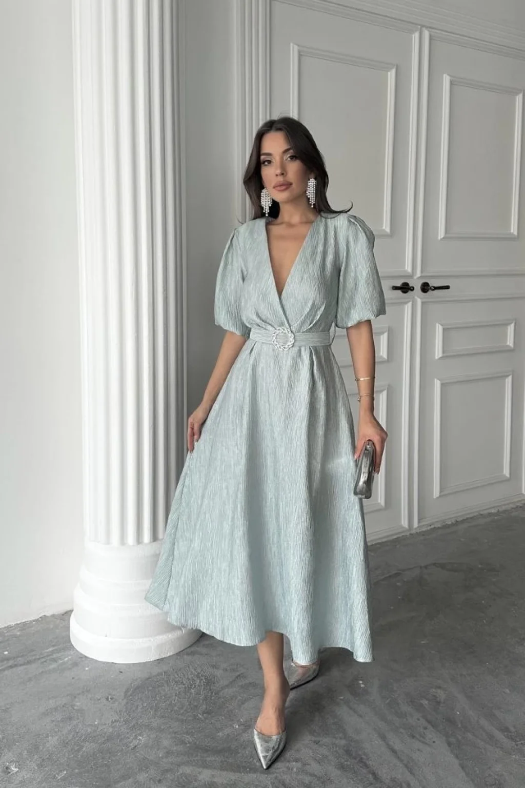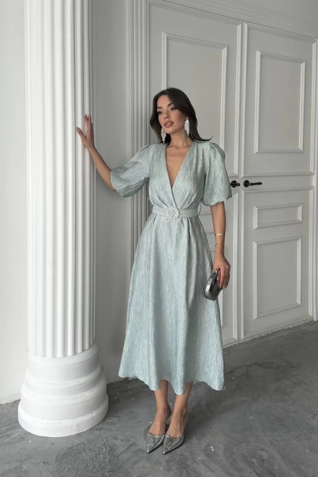 <p>Mint Işıltılı Kemerli Kruvaze Elbise</p><br> <p>Modelin Ölçüleri: Boy:165, Kg:55, Göğüs:90, Bel:72, Kalça: 100</p><br> <p>Modelin üzerindeki ürün M/38 bedendir</p><br> <ul> </ul>