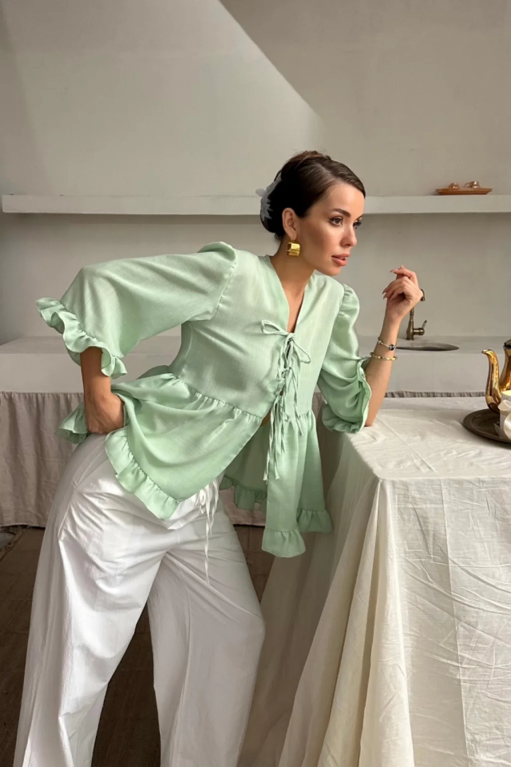 KETEN BLUZ ÖNDEN BAĞLAMALI FIRFIR DETAYLI - Yeşil