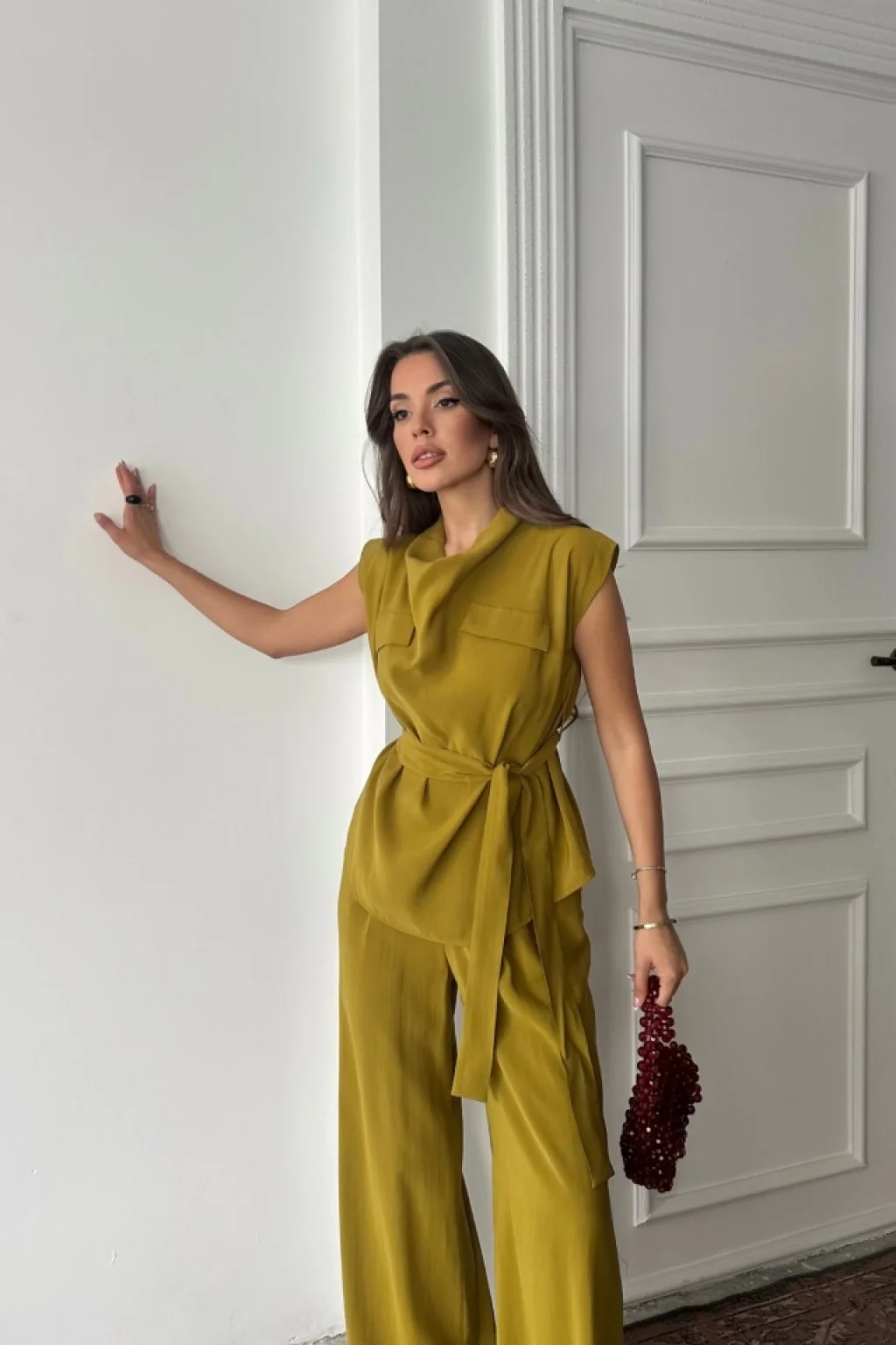 TENCEL MODAL KOLSUZ BLUZ KAPALI CEP DETAYLI DÖKÜMLÜ - PANTOLON TAKIM - Yağ Yeşili