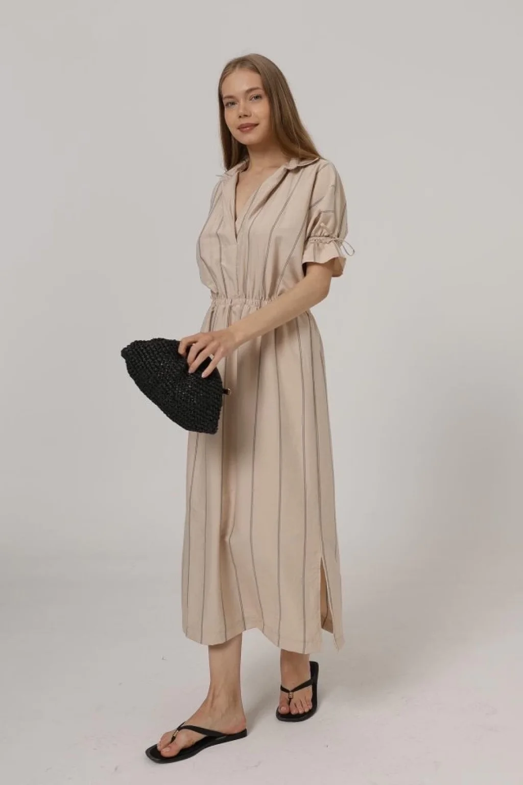 Kadın V Yaka Büzgülü Ip Detay Aerobin Kumaş Elbise