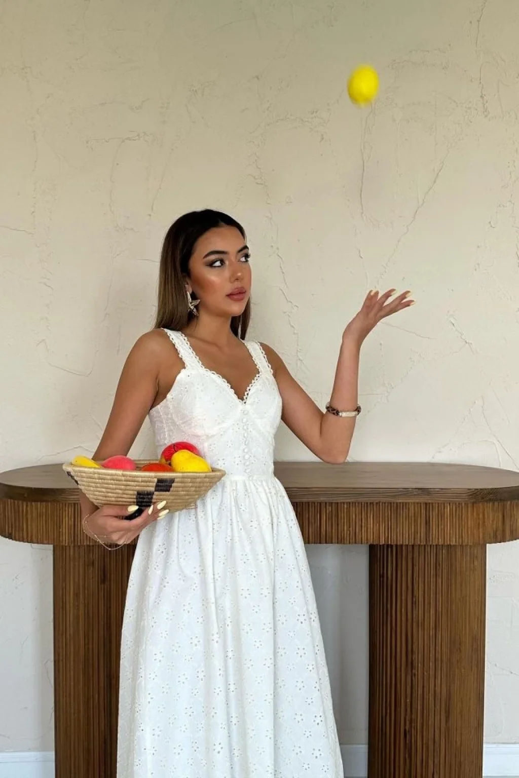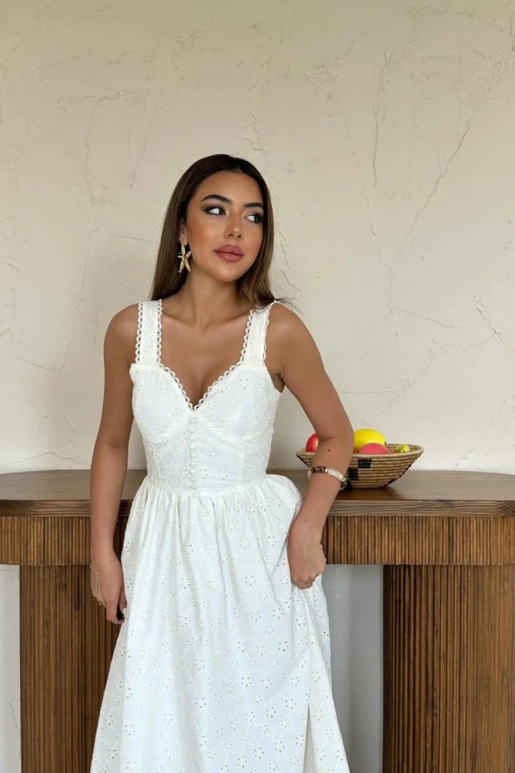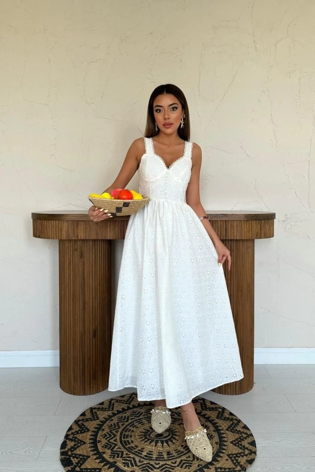 Ekru Dantel Detaylı Askılı Elbise