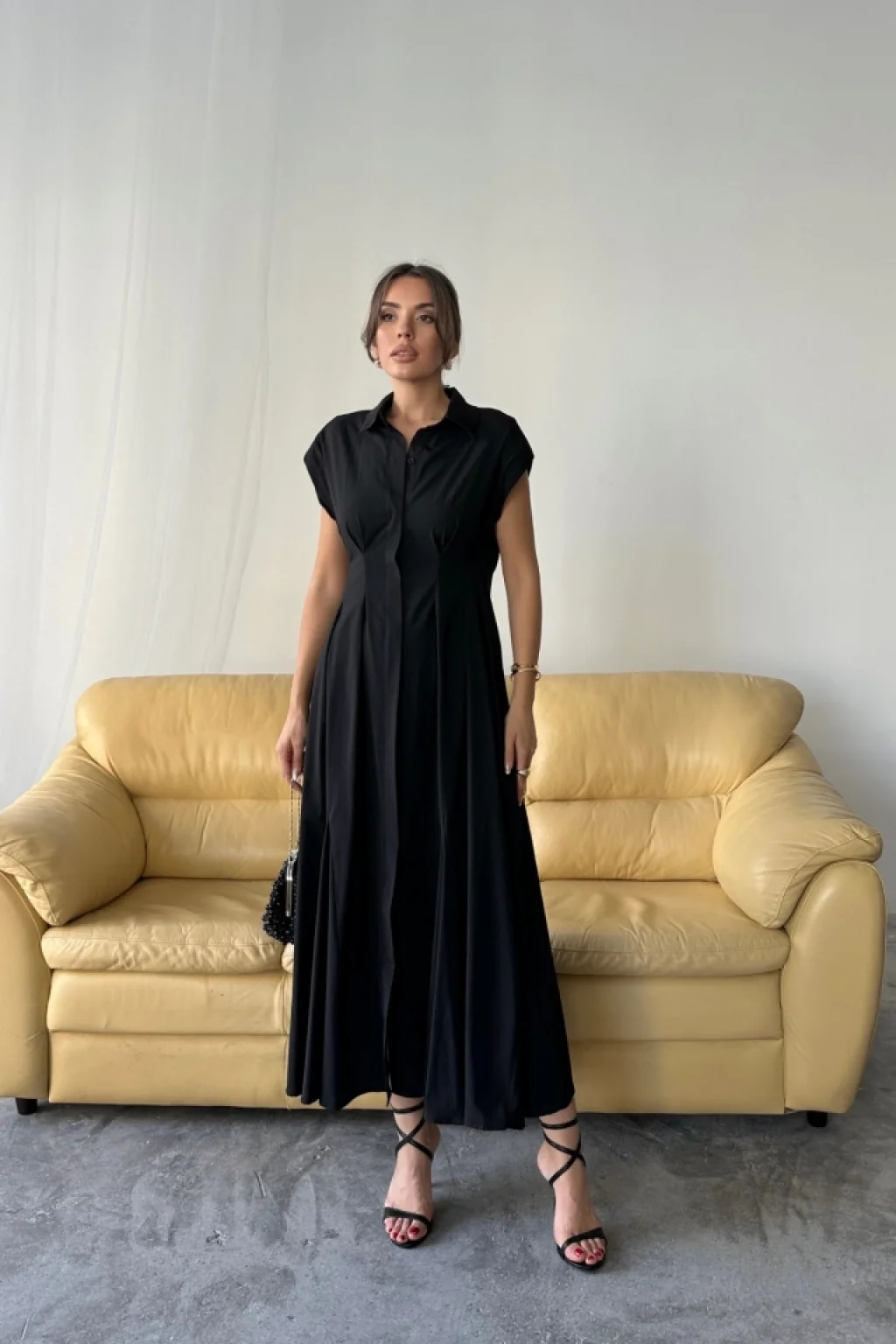 Kadın Uzun Kollu Geometrik Yaka Midi Ithal Krep Elbise