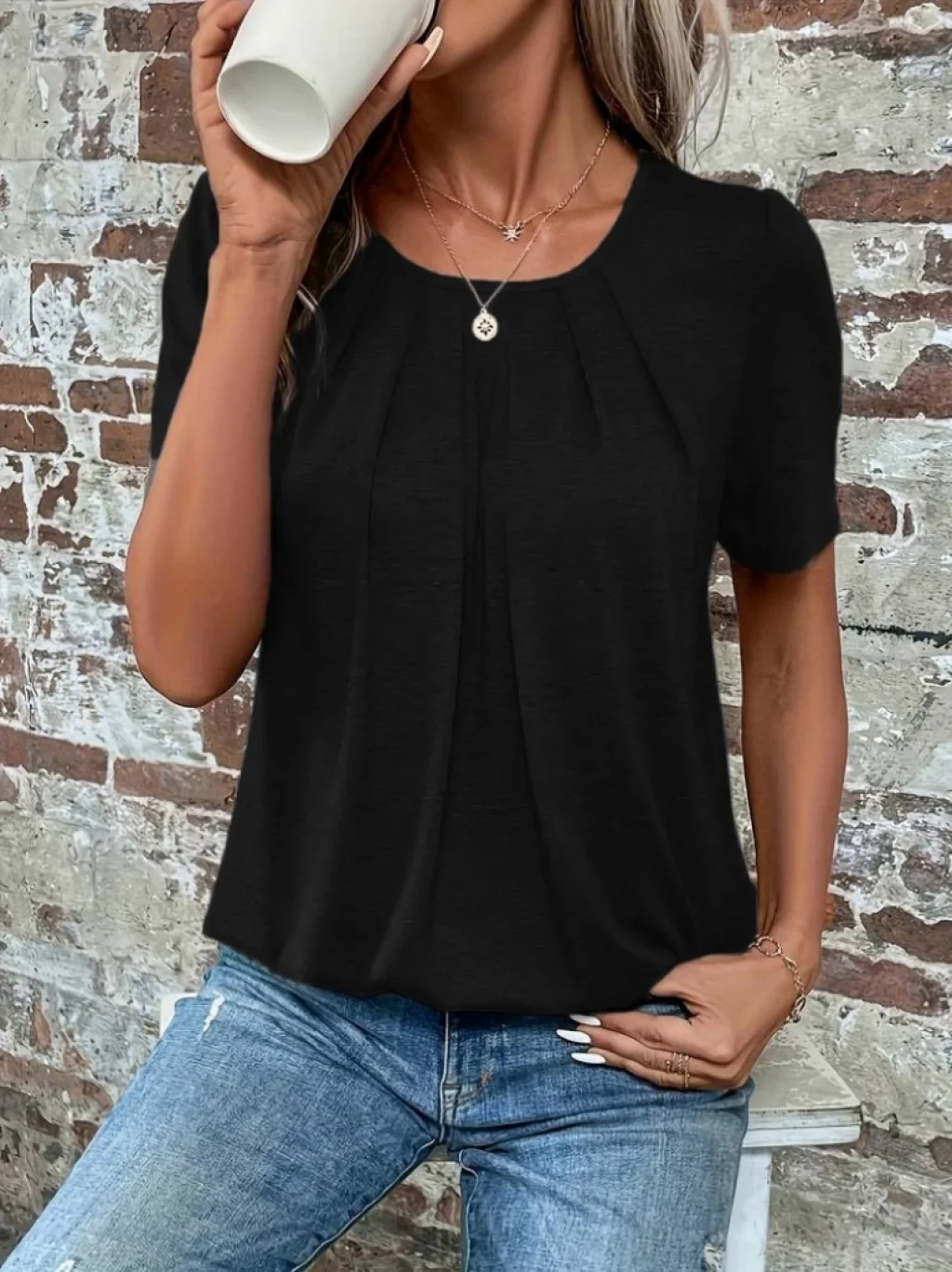 Kadın Kısa Kollu Yuvarlak Yaka önden Pileli Salaş Viskon Bluz