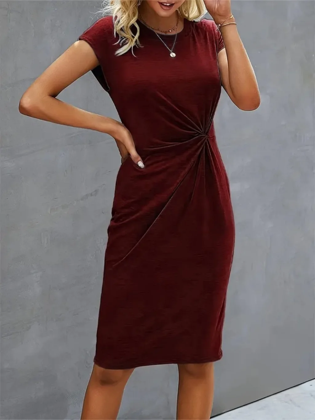 Kadın Kısa Kollu Bisiklet Yaka Yandan Büzgülü Midi Viskon Elbise