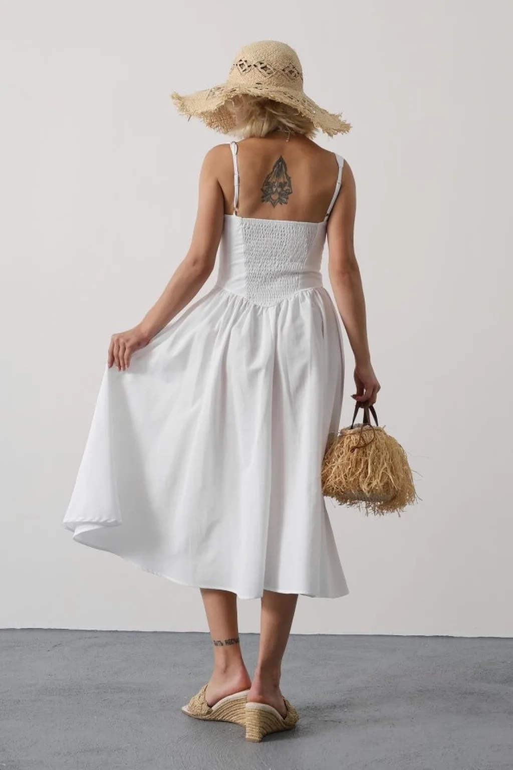 <p>Askılı Uzun Elbise - Beyaz</p><br> <p>Modelin Ölçüleri: Boy:165, Kg:55, Göğüs:90, Bel:72, Kalça: 100</p><br> <p>Modelin üzerindeki ürün M/38 bedendir</p><br> <ul> </ul>