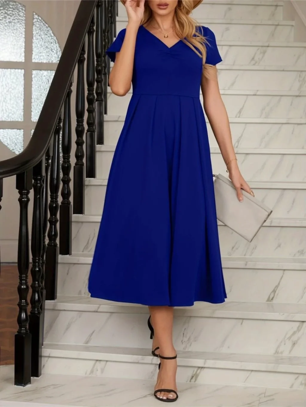 Kadın Kısa Kollu V Yakalı önden Pileli Midi Janjan Krep Elbise