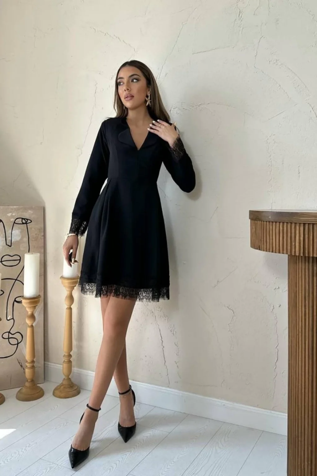 <p>Siyah Dantel Detaylı Kruvaze Yaka Elbise</p><br> <p>Modelin Ölçüleri: Boy:165, Kg:55, Göğüs:90, Bel:72, Kalça: 100</p><br> <p>Modelin üzerindeki ürün M/38 bedendir</p><br> <ul> </ul>