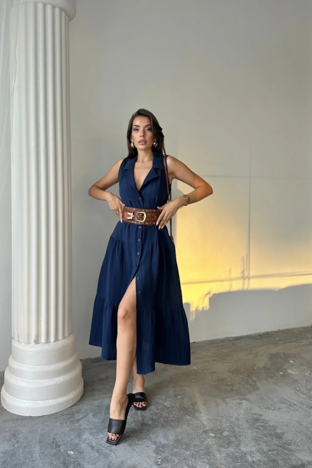 MÜSLİN ELBİSE GÖMLEK YAKA KOLSUZ ÖNDEN DÜĞMELİ - Lacivert