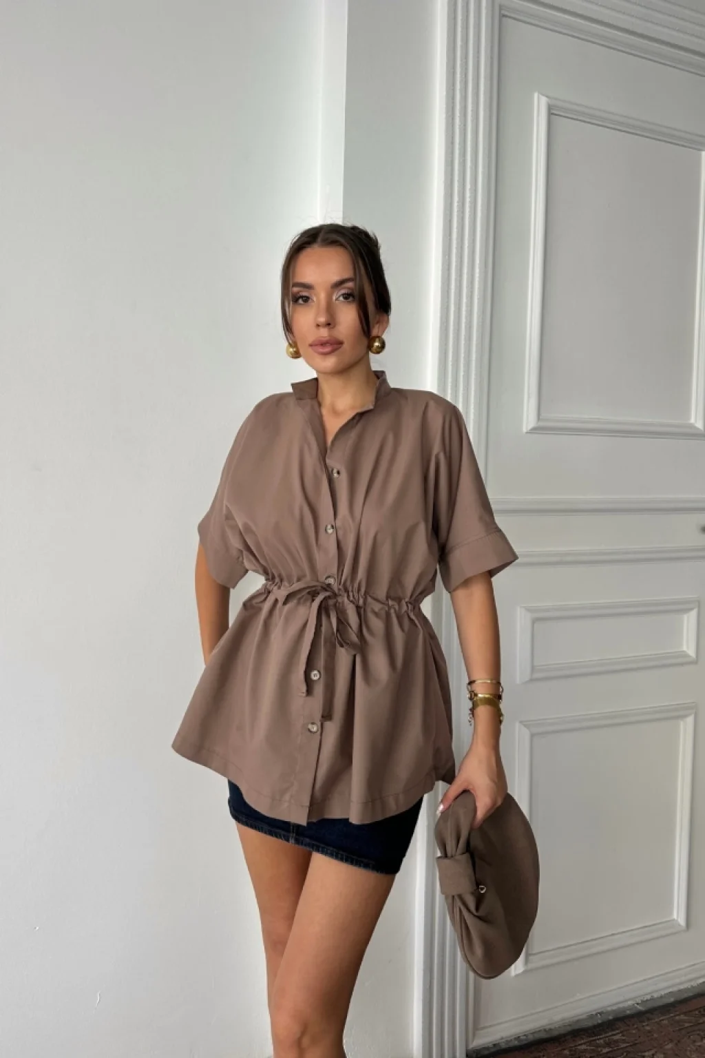 BEL BÜZGÜ DETAYLI POPLİN GÖMLEK - Kahverengi