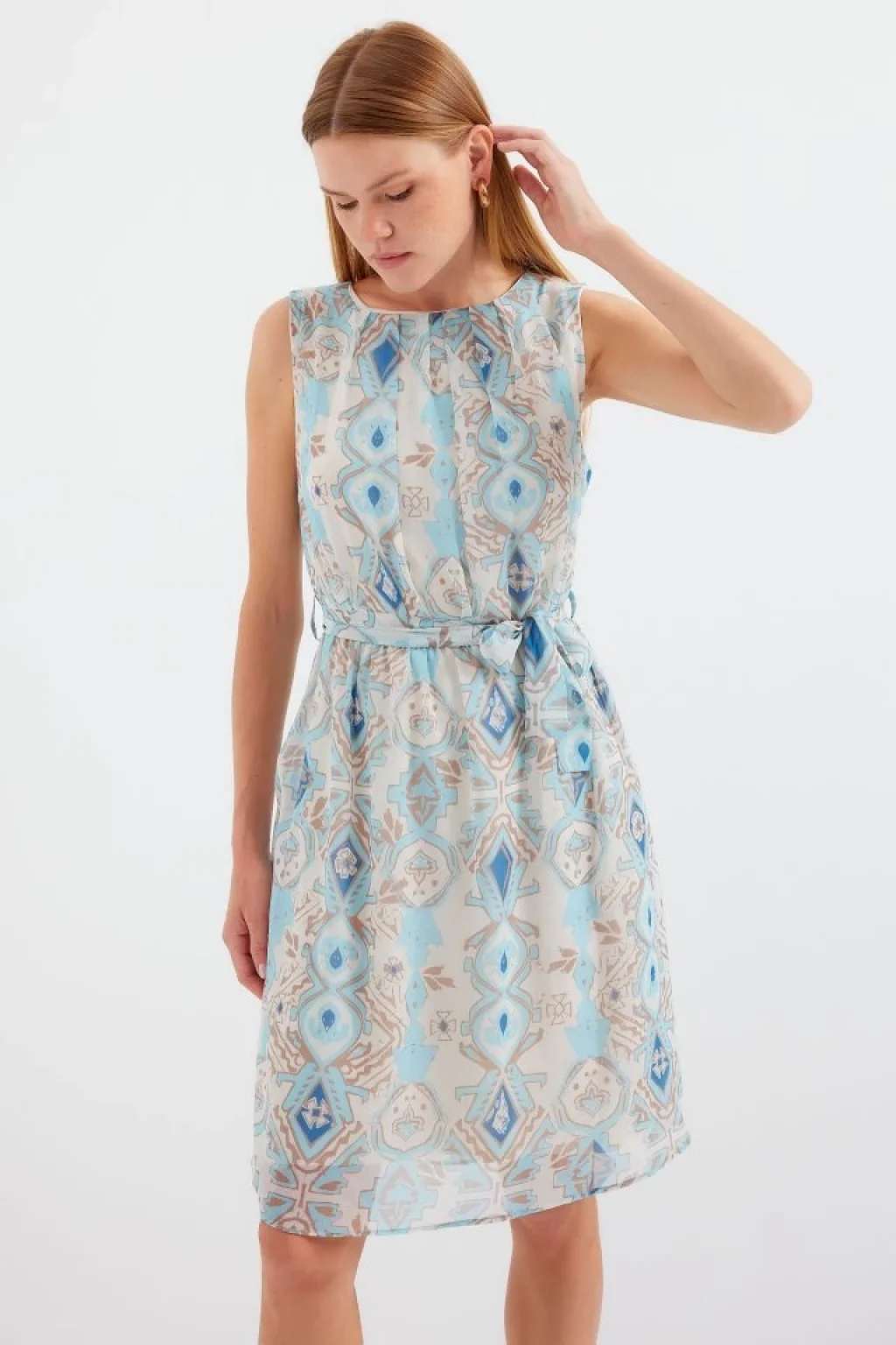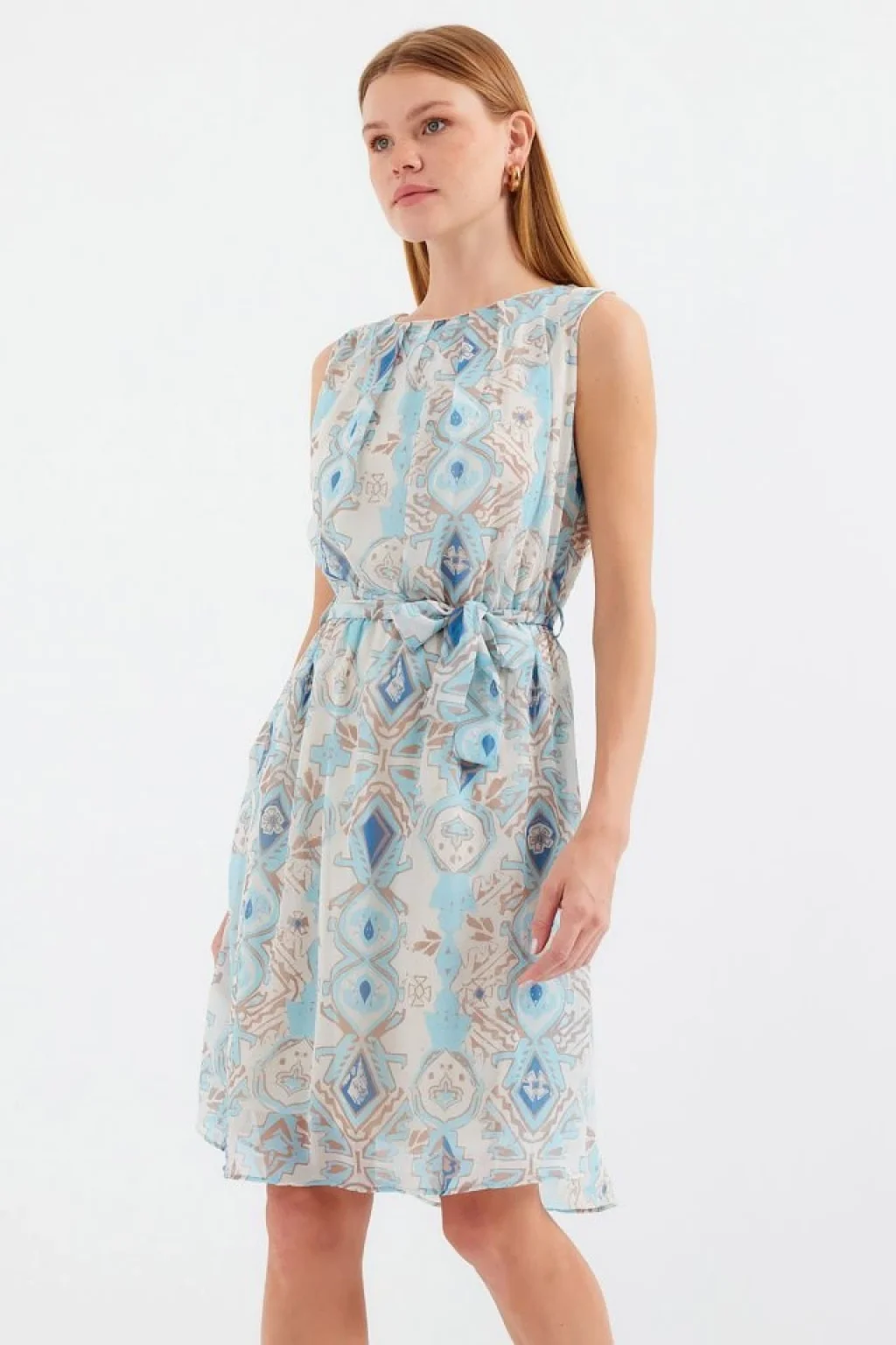 2501 Desenli Sıfır Kol Şifon Elbise - Mavi