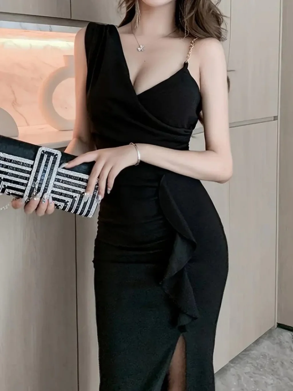 Kadın Ip Zincir Askılı Kruvaze Yakalı önden Fırfırlı Yırtmaçlı Janjan Krep Elbise