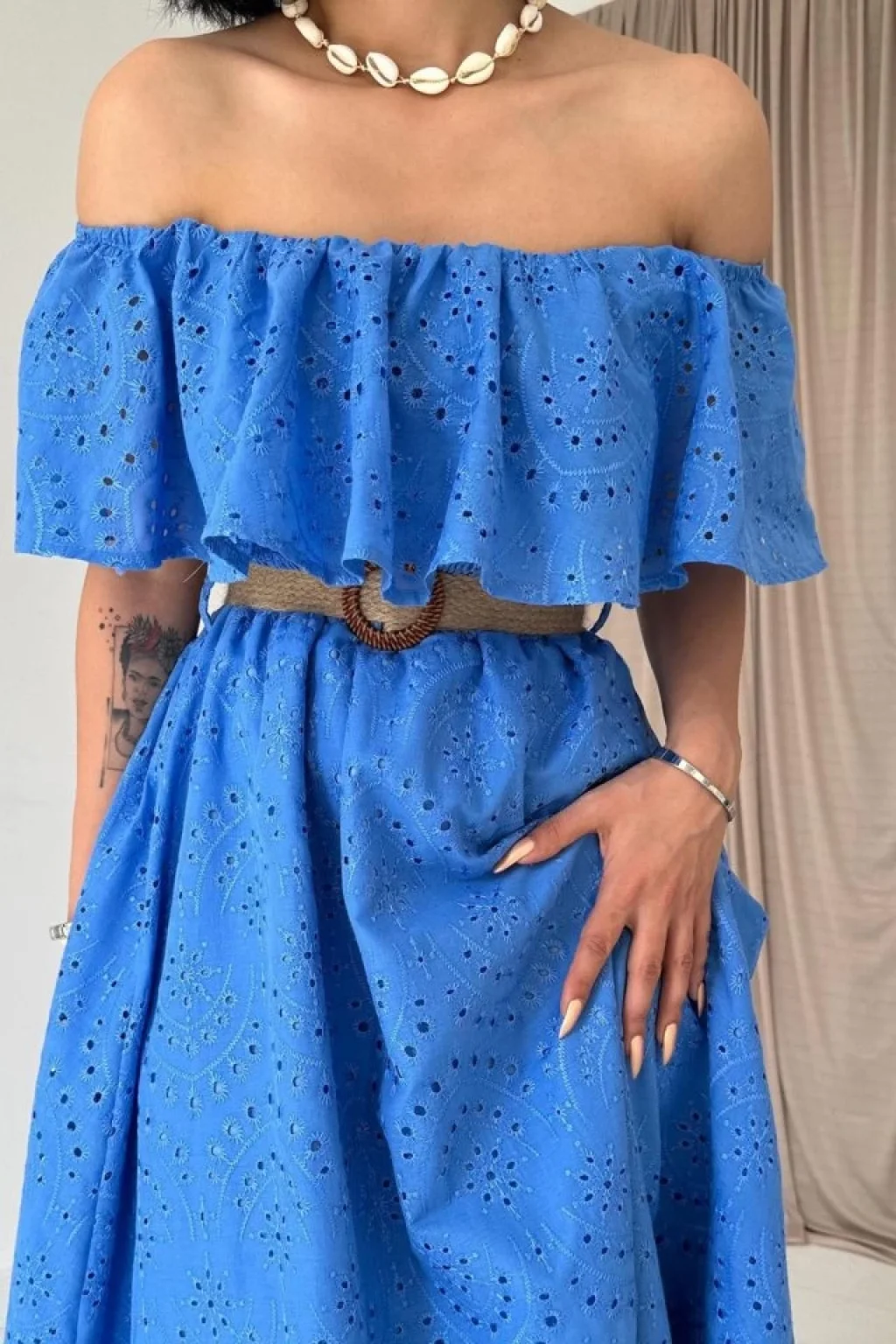 Bebe Mavi Omzu Lastikli Brode Elbise