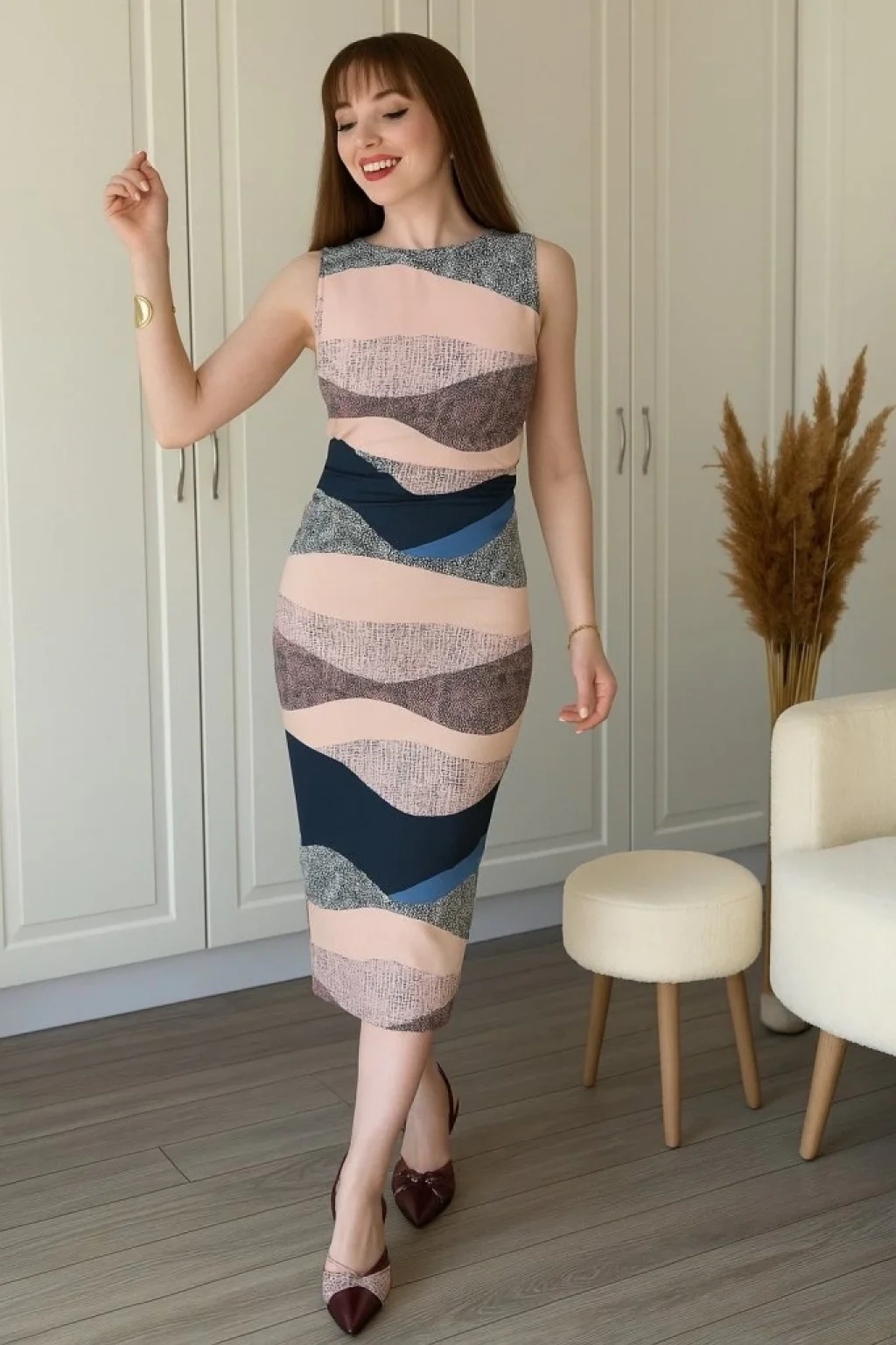 Kadın Sıfır Kol Sıfır Yaka Drape Detaylı Midi Janjan Dalgıç Elbise