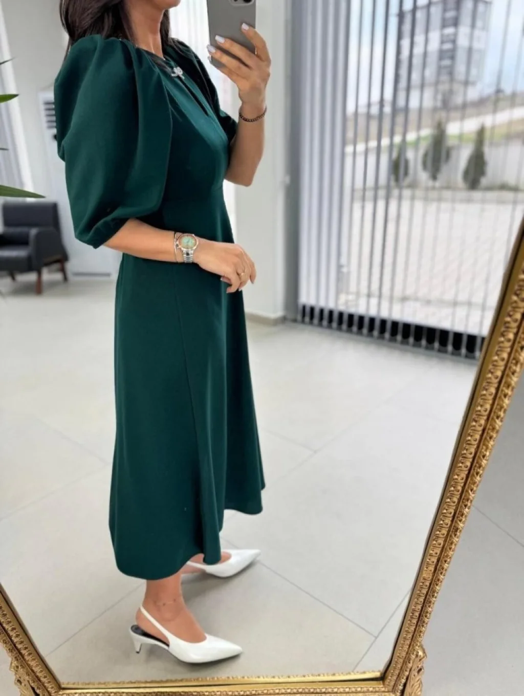 Kadın Uzun Kollu Geometrik Yaka Midi Ithal Krep Elbise