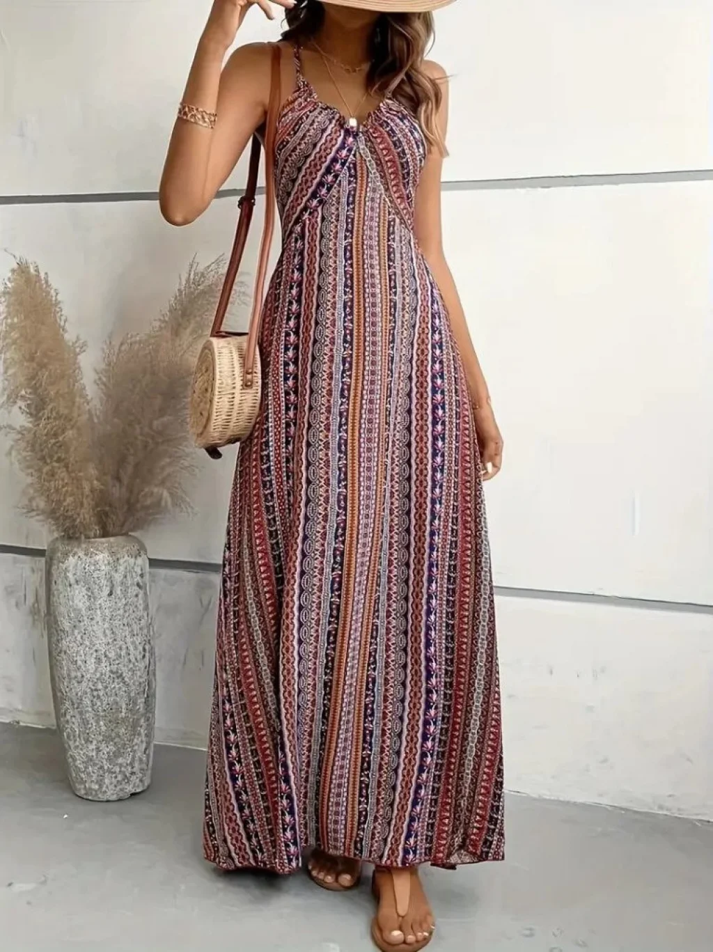 Kadın Ip Askılı Sırttan çapraz Detaylı Yırtmaçlı Desenli Süprem Elbise