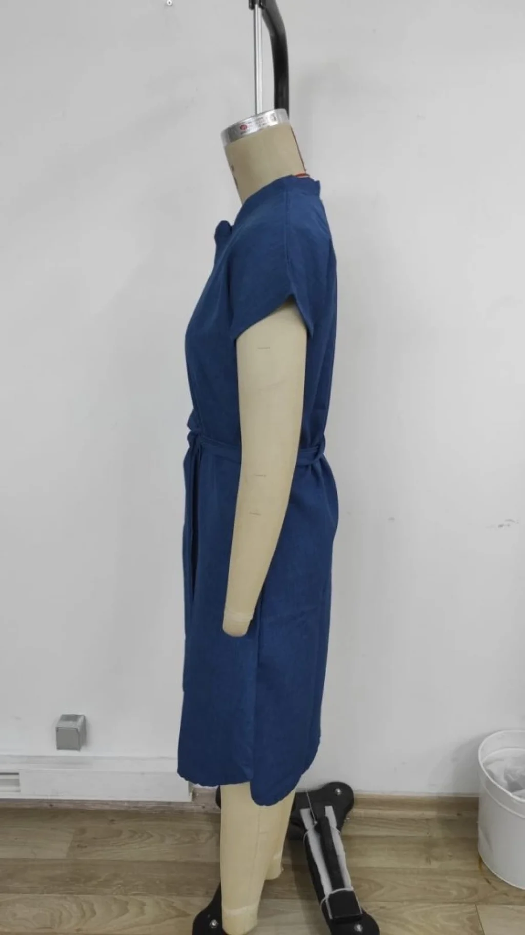 Kadın Kısa Kollu V Hakim Yaka Belden Kuşaklı Valencia Elbise