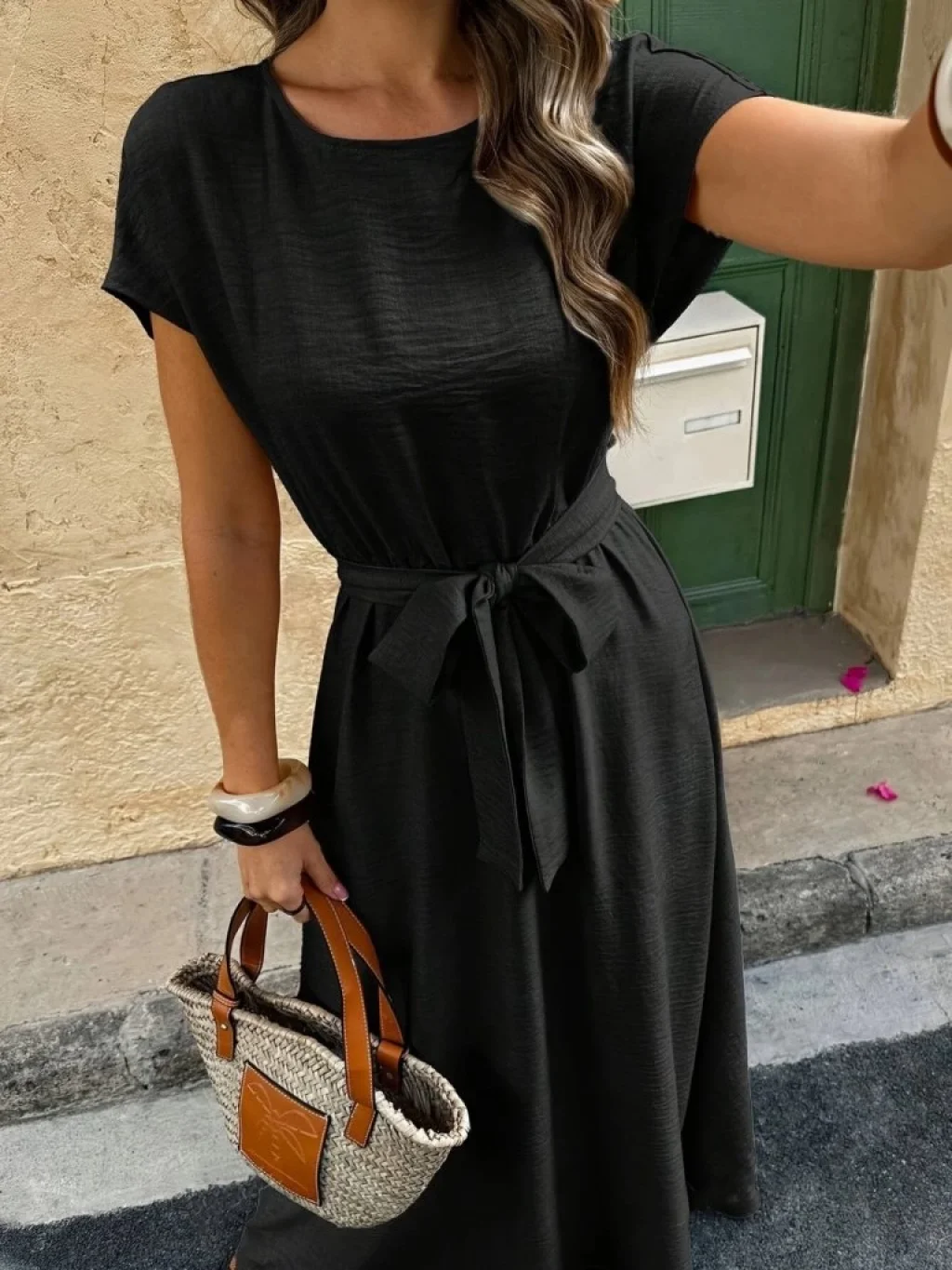 Kadın Kısa Kollu Kayık Yaka Beli Kuşaklı Aerobin Elbise