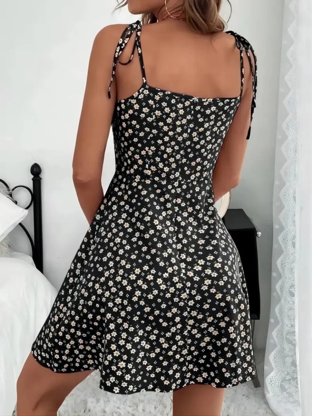 Kadın Ip Askılı Omuzlardan Bağcıklı çiçek Desenli Süprem Elbise