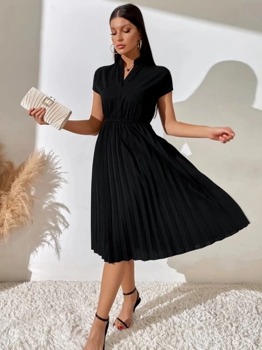 Kadın Kısa Kollu Hakim V Yakalı Pileli Janjan Krep Elbise