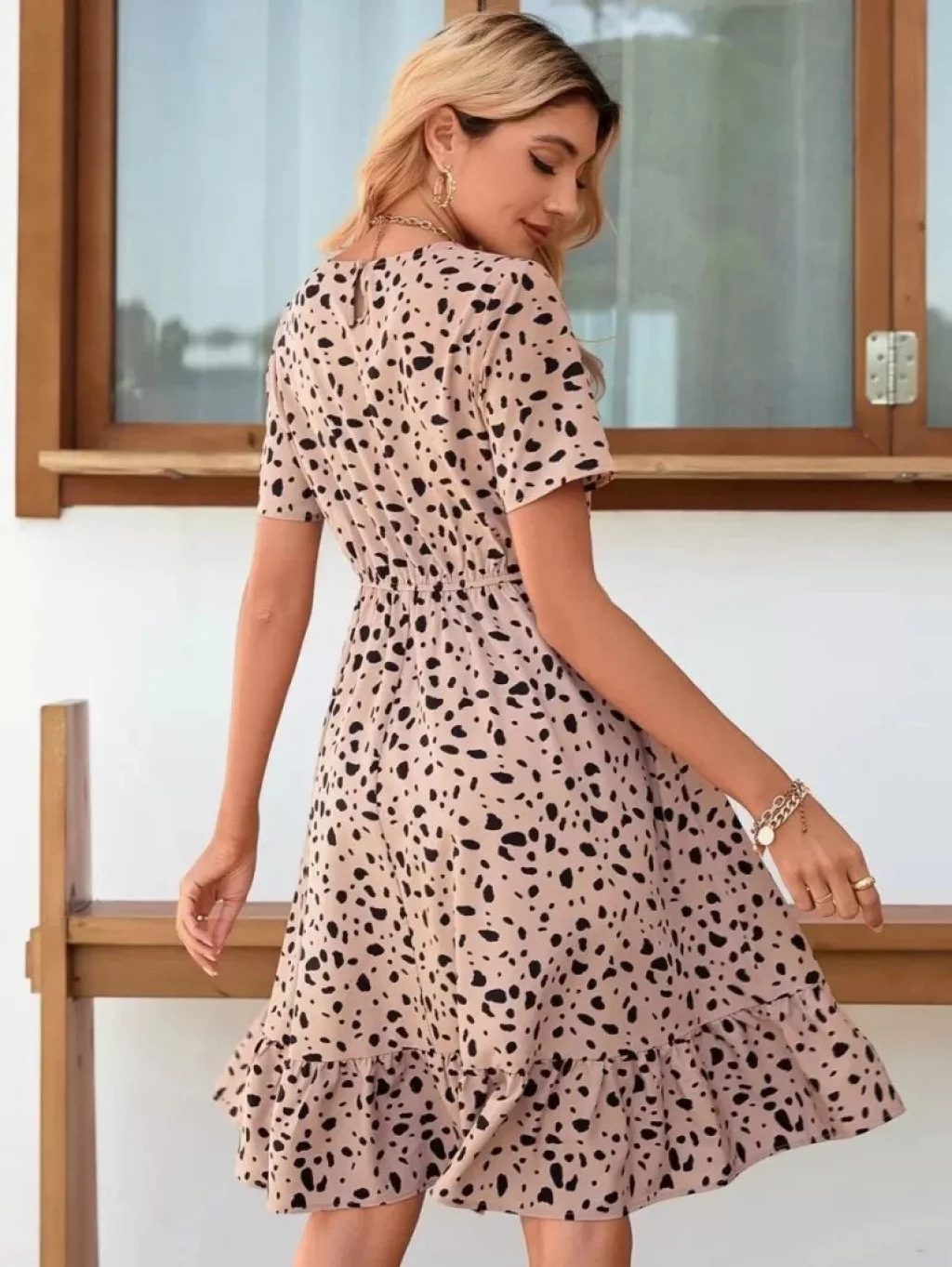 Kadın Uzun Kollu Kruvaze Yakalı Fırfırlı Belden Kuşaklı Leopar Desen Modal Elbise