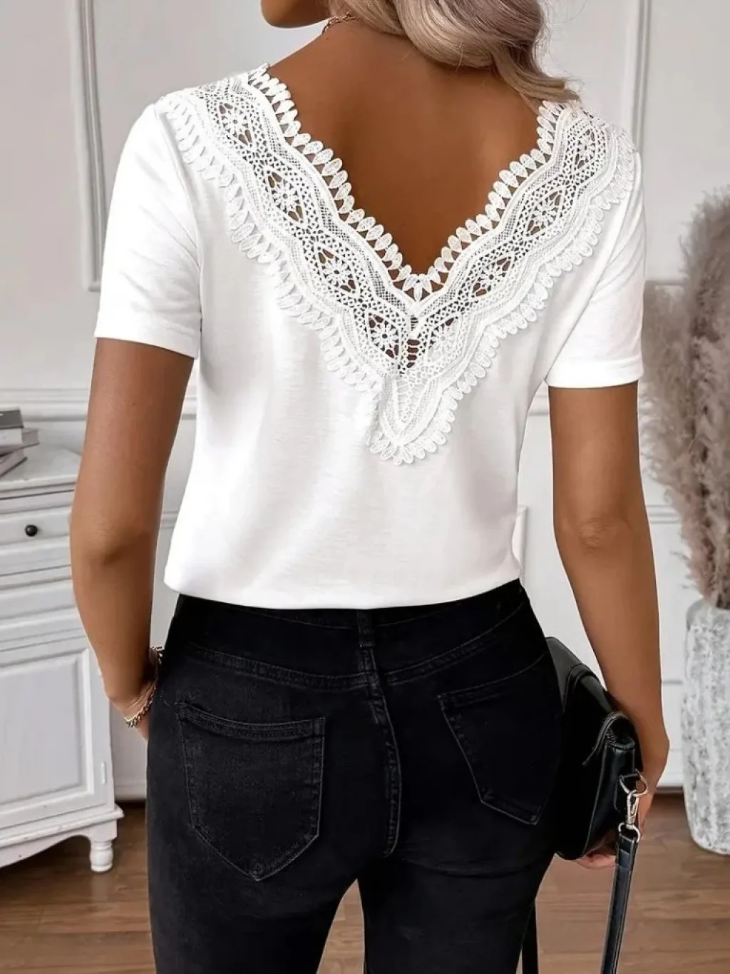 Kadın Kısa Kollu V Yakalı Arkası Dantelli Viskon Bluz