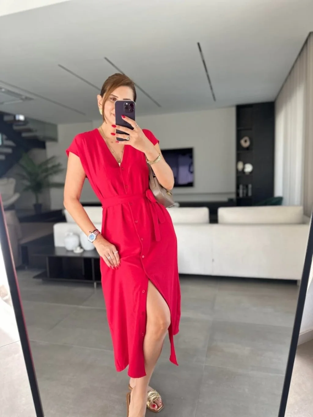 Kadınn V Yaka Düğme Detay Kuşak Dahil Elbise