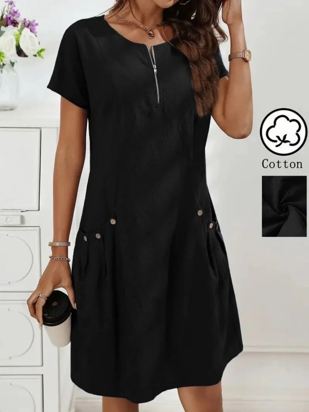 Kadın Kısa Kollu Yakası Açık Fermuarlı Cep Detaylı Ithal Keten Elbise