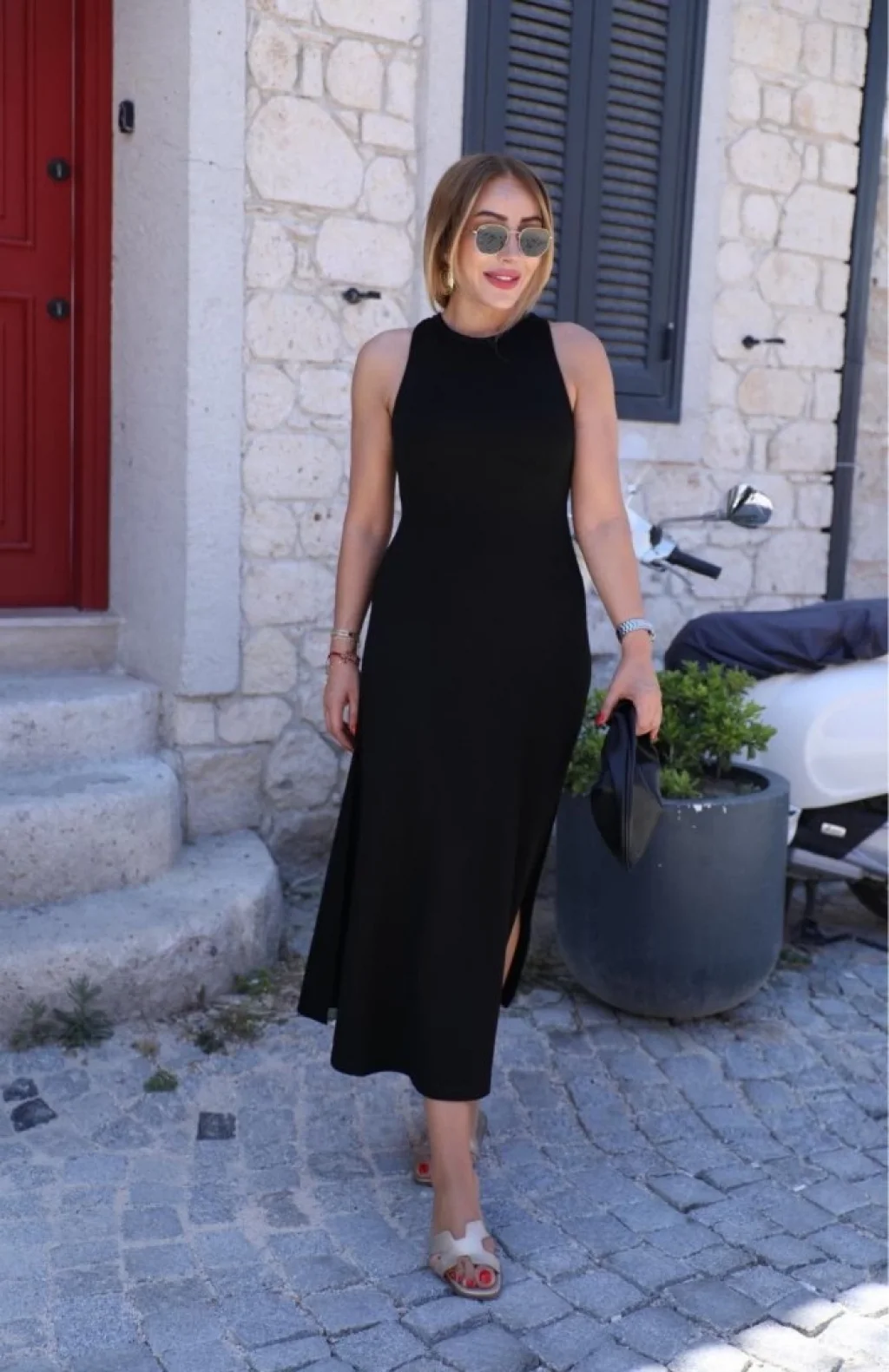 Kadın Uzun Kollu Bisiklet Yaka Yandan Yırtmaçlı Midi Triko Elbise