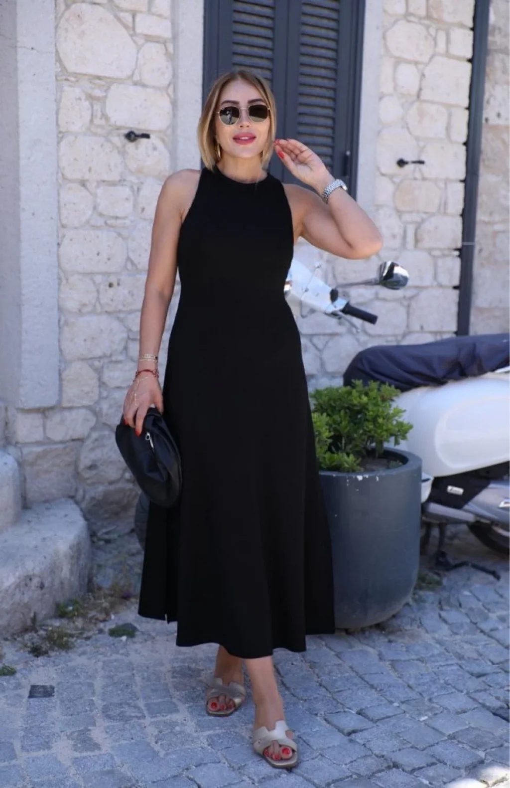 Kadın Uzun Kollu Geometrik Yaka Midi Ithal Krep Elbise