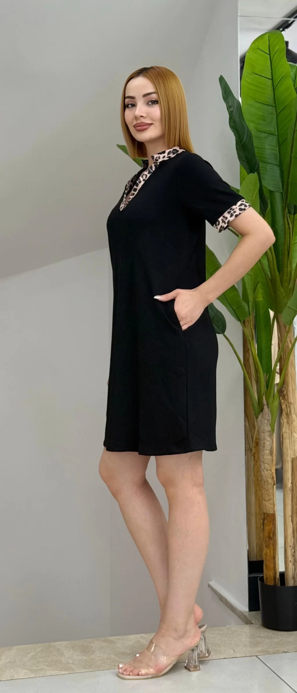 Kadın Kısa Kollu V Yakalı Leopar Desen Detaylı Modal Elbise