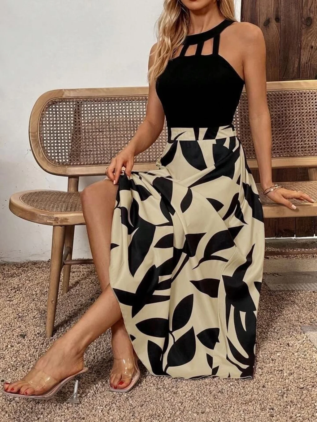 Kadın Sıfır Kollu Yakadan şeritli Omuzlardan Açık Janjan Krep Desenli Al Dalgıç Maxi Elbise