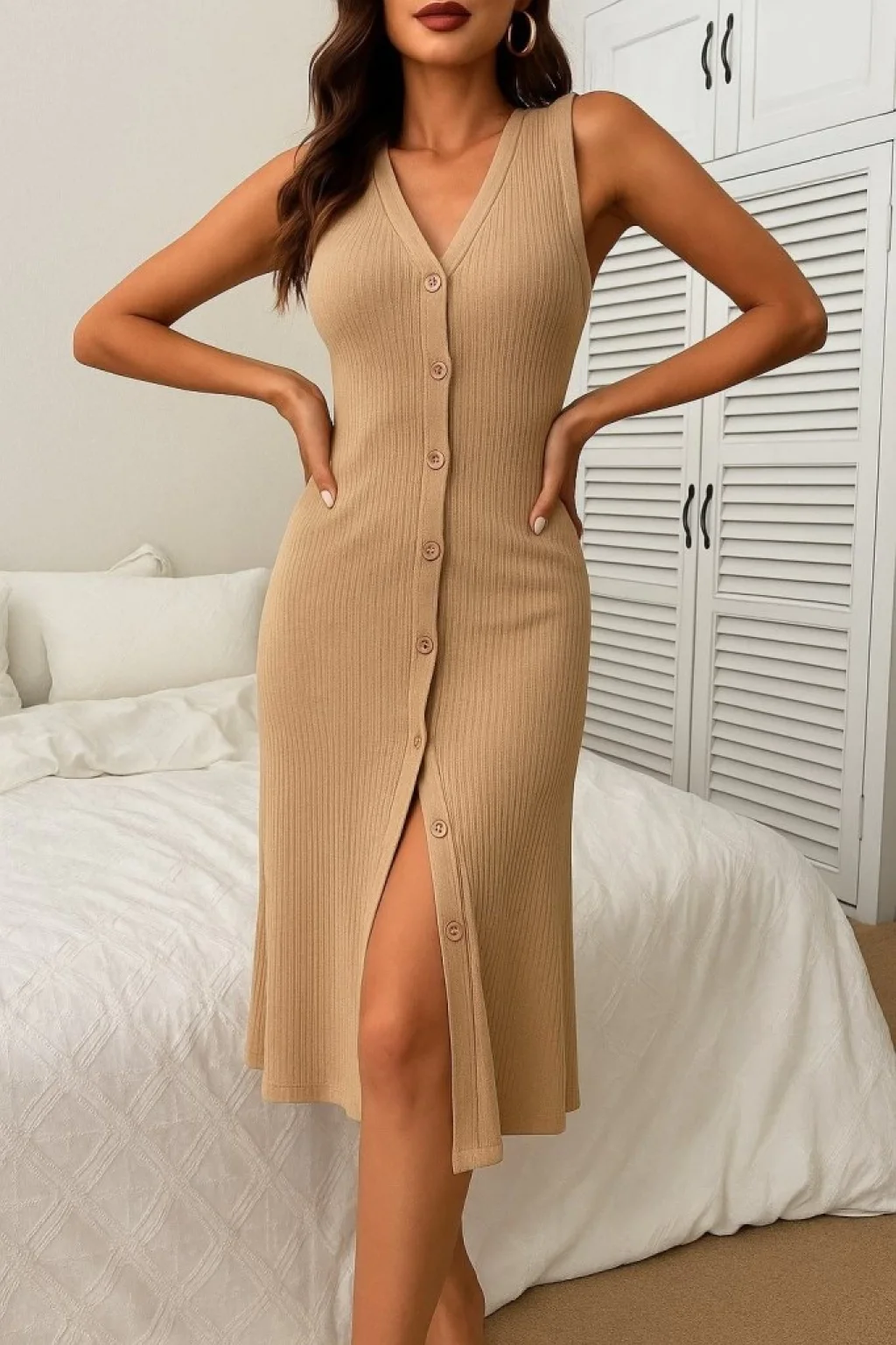 Kadın Uzun Kollu Balıkçı Yaka Yırtmaçlı Düğmeli şardonlu Kaşkorse Elbise