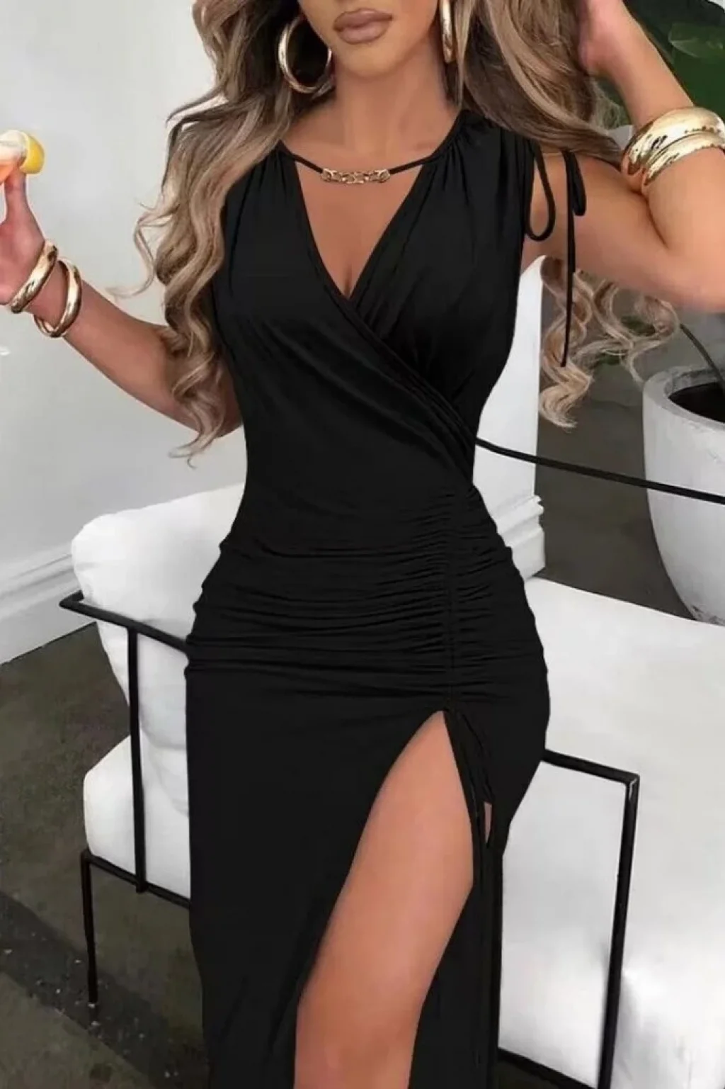 Kadın Sıfır Kollu V Yakalı Yırtmaç Detaylı Beli Büzgülü Omuzdan Bağcıklı Sandy Maxi Elbise