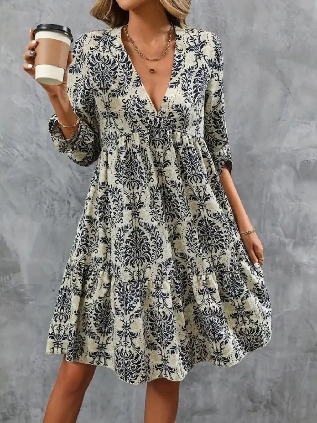 Kadın Uzun Kollu V Yakalı Fırfırlı Mini Süprem Elbise
