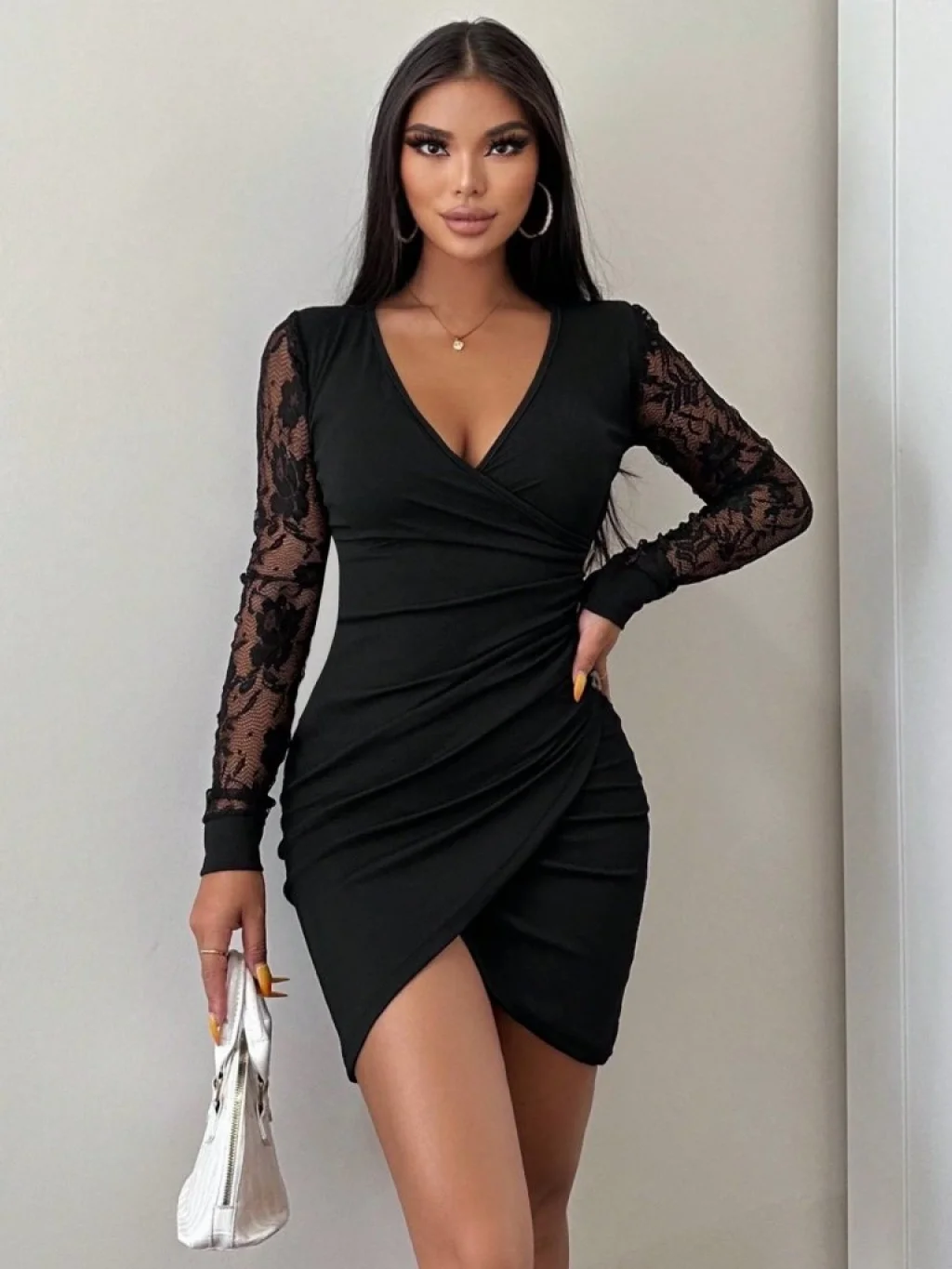 Kadın Uzun Kollu Göğüs Dekolteli Kadife Kumaş Mini Kruvaze Elbise