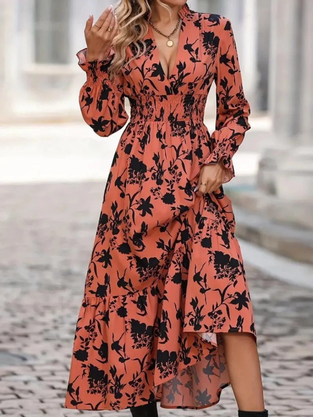 Kadın Uzun Kollu Kruvaze Yakalı Desenli Süprem Maxi Elbise