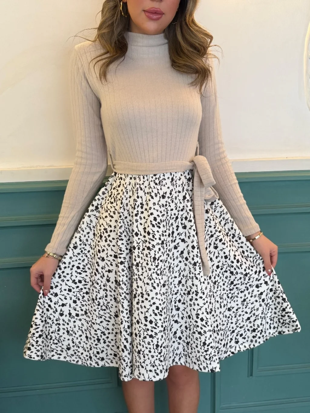 Kadın Uzun Kollu Balıkçı Yaka Belden Bağlamalı üst Kaşkorse Eteği Dalgıç Kısa Elbise