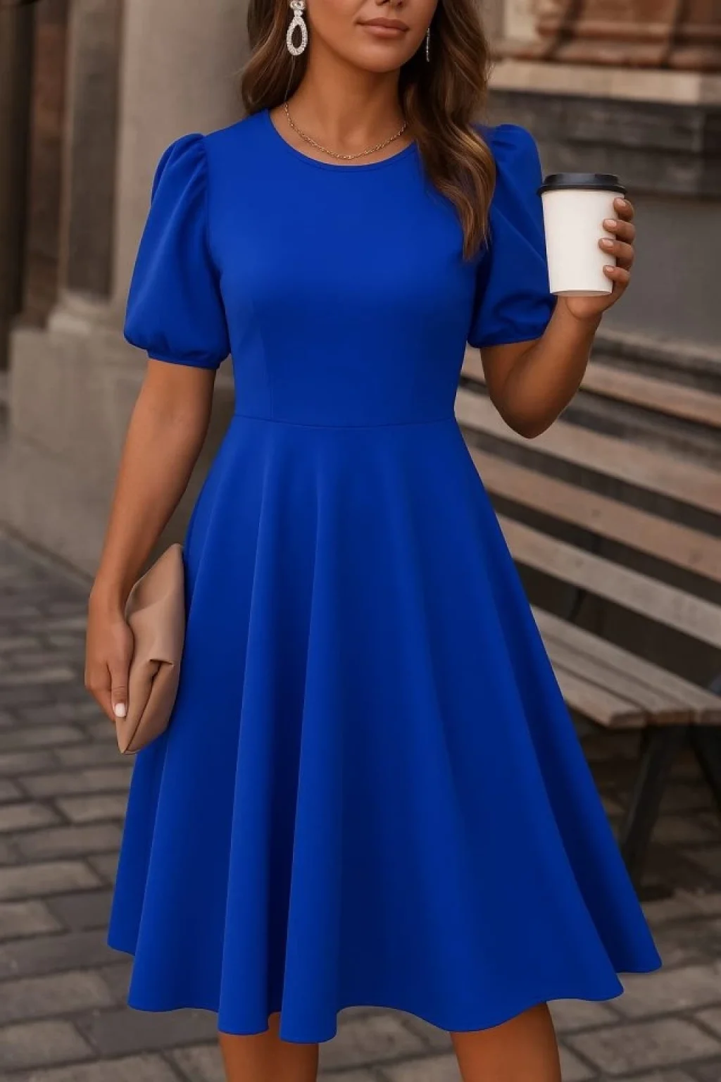 Kadın Kısa Balon Kollu Bisiklet Yaka Geniş Kesim Janjan Krep Elbise