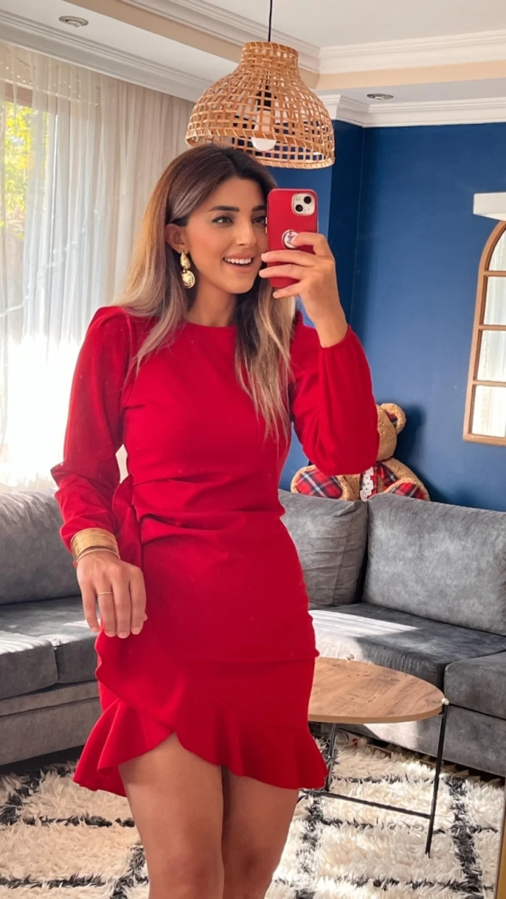 Kadın Uzun Kollu Yuvarlak Yaka Pileli Salaş Mini Ithal Krep Elbise