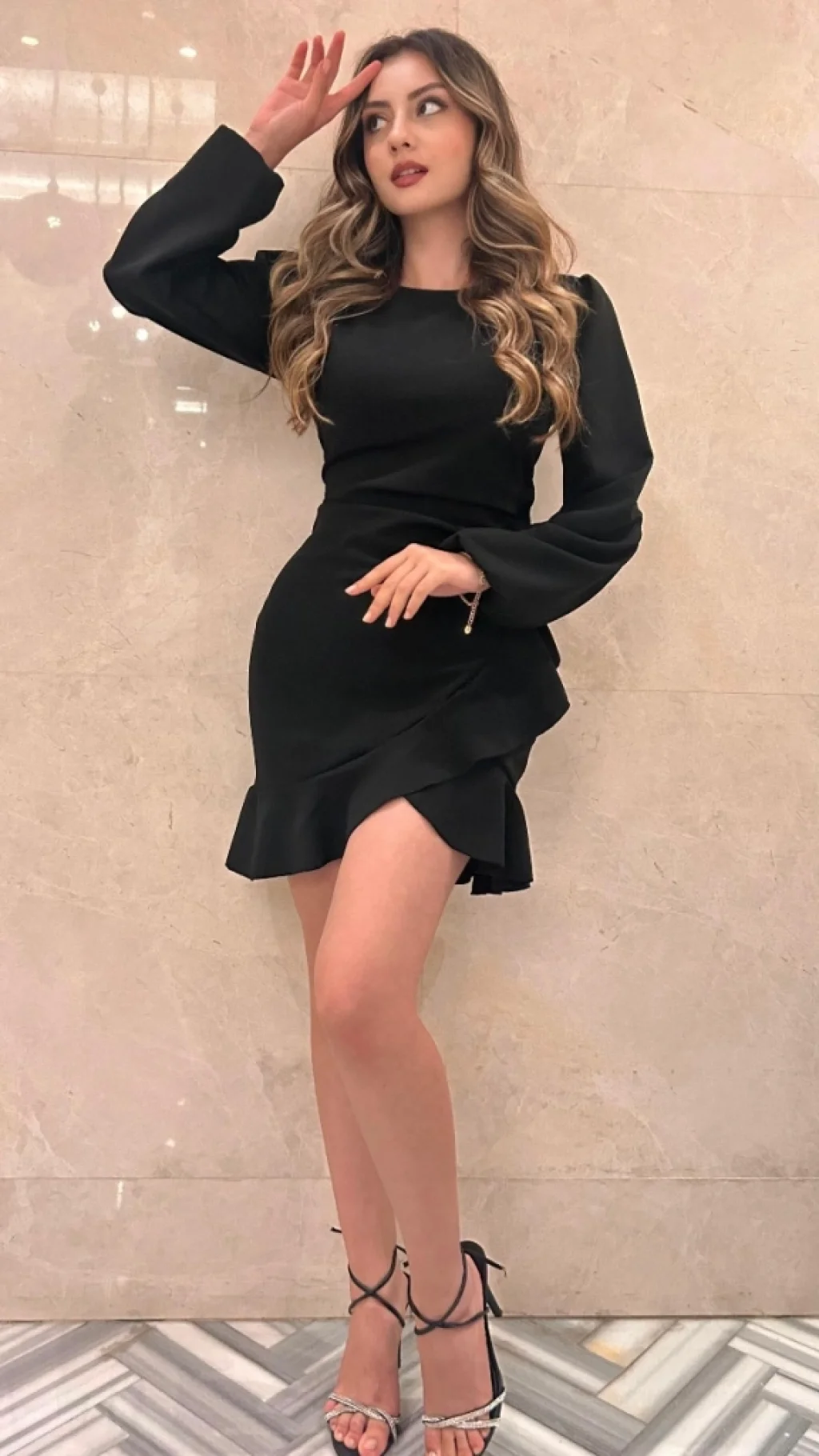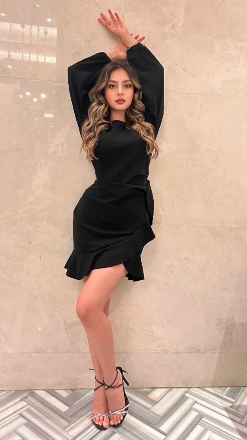 Kadın Uzun Kollu Yuvarlak Yaka Pileli Salaş Mini Ithal Krep Elbise