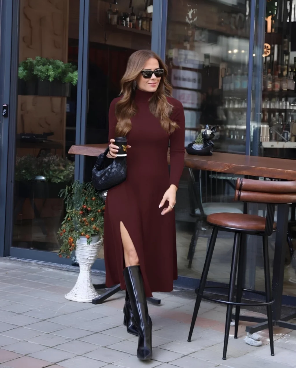 Kadın Uzun Kollu Bisiklet Yaka Yandan Yırtmaçlı Midi Triko Elbise