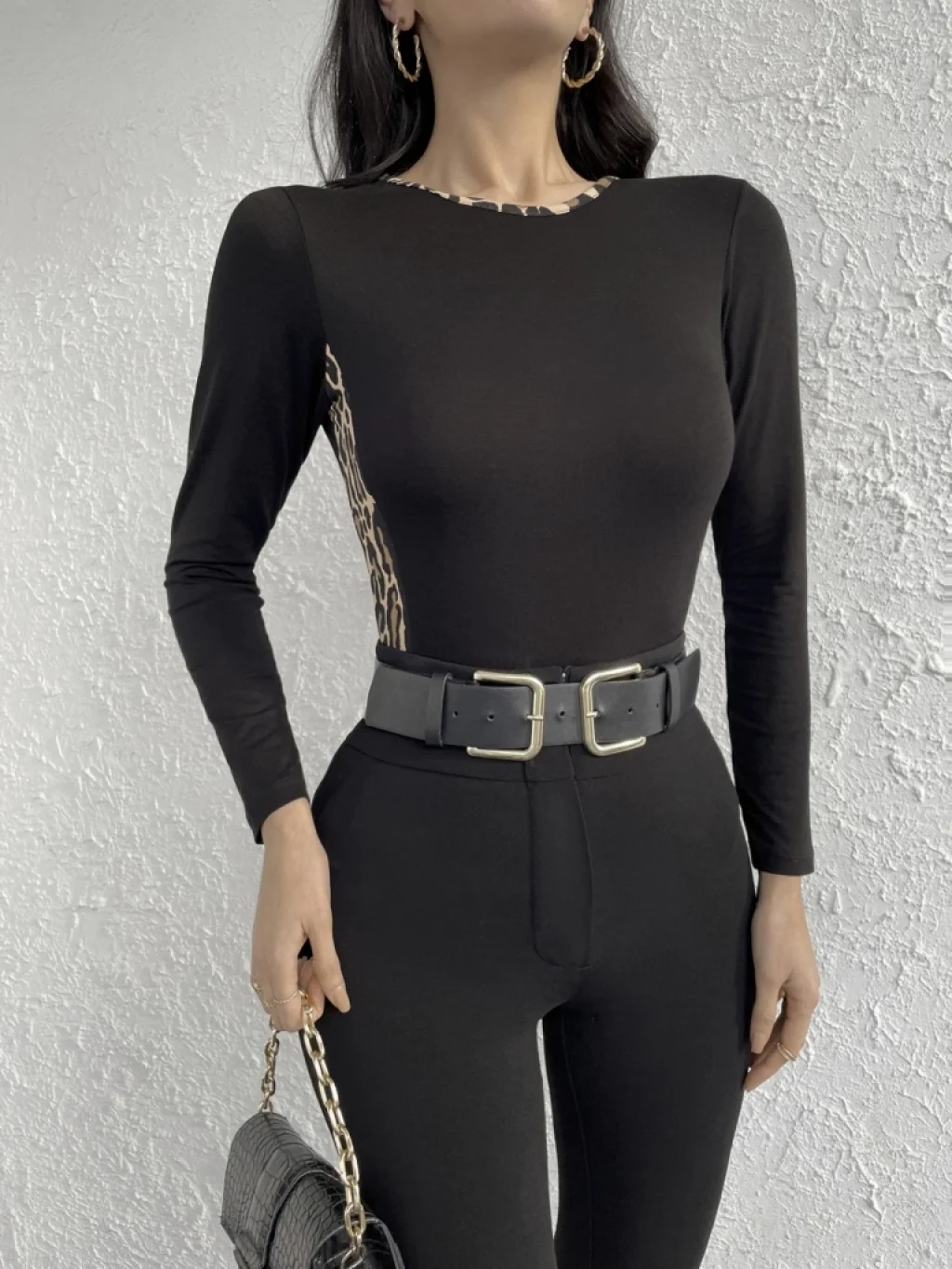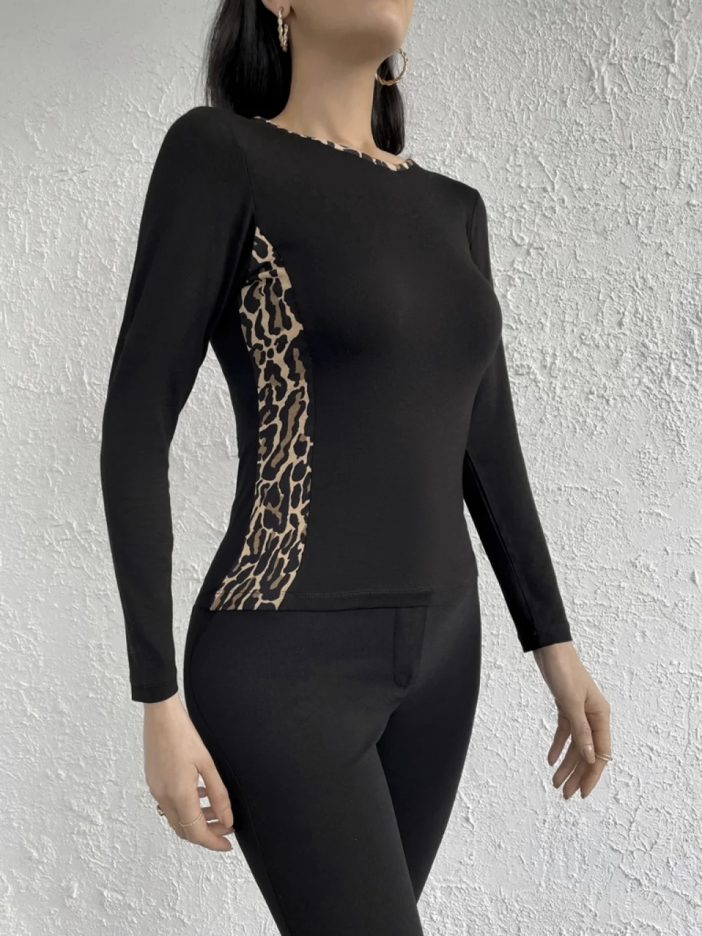 Kadın Uzun Kollu Yarı Balıkçı Yaka Leopar Detaylı Kaşkorse Bluz