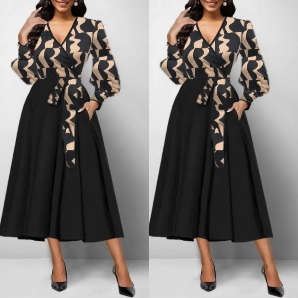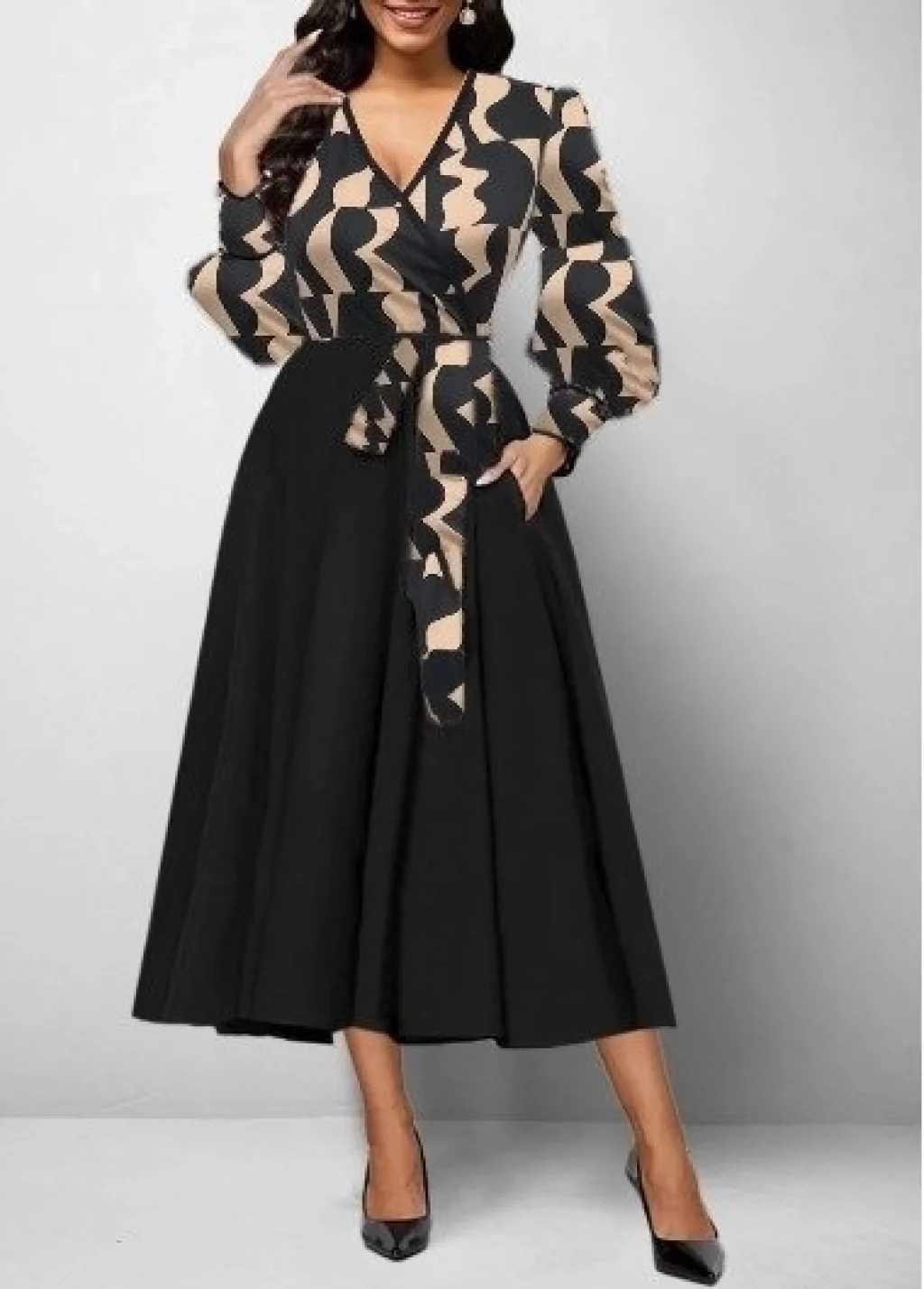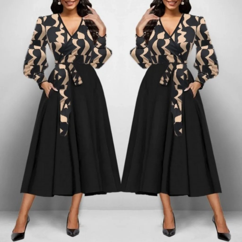 Kadın Uzun Kollu Kruvaze Yakalı Desenli Süprem Maxi Elbise