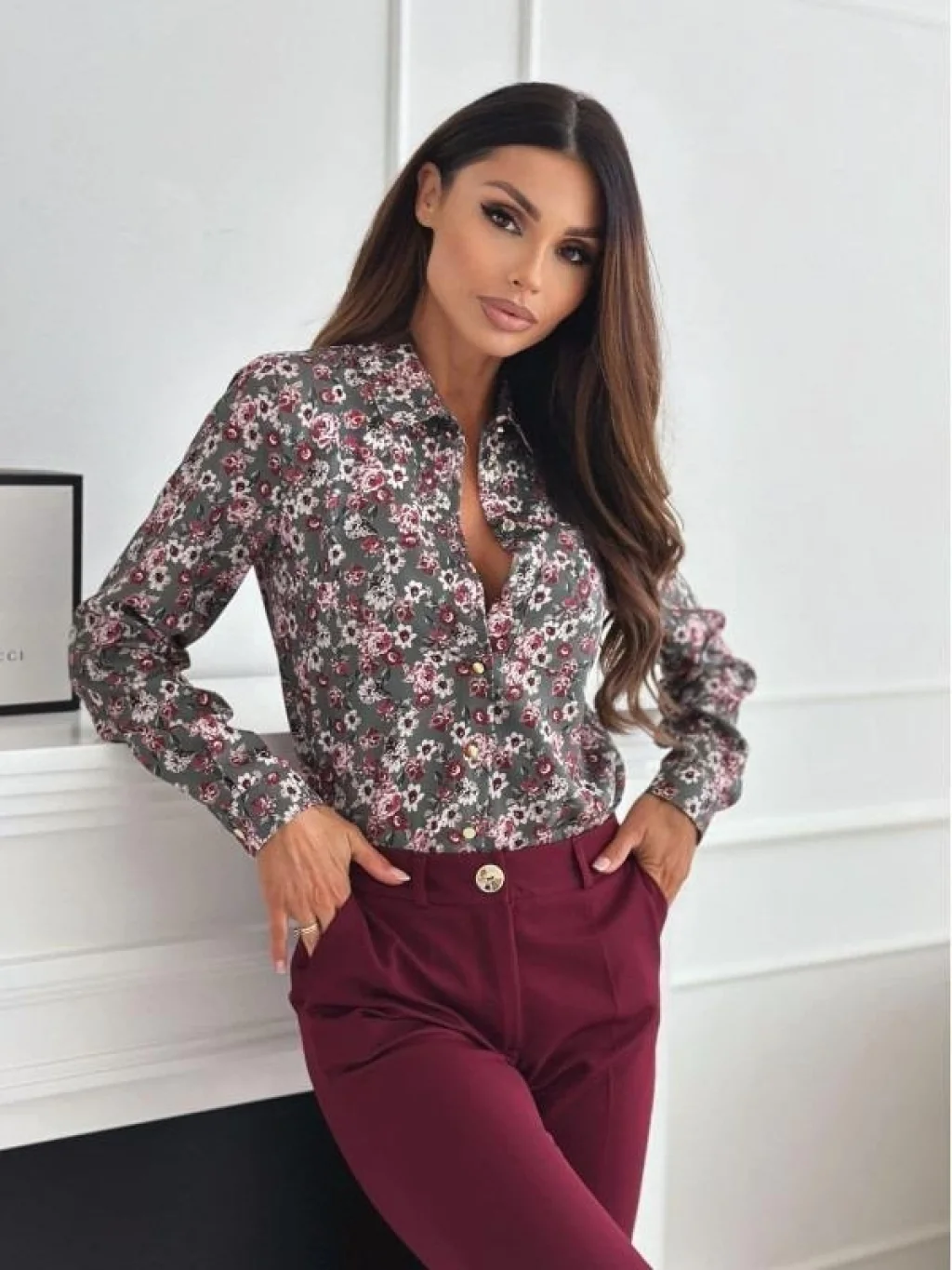Kadın Uzun Kol Cep Detay çiçek Baskılı Mosskrep Kumaş Gömlek