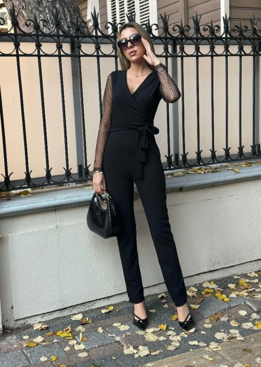 Kadın Uzun Kollu Kruvaze Yakalı Kolları Tül Detay Beli Kuşaklı Ithal Krep Tulum