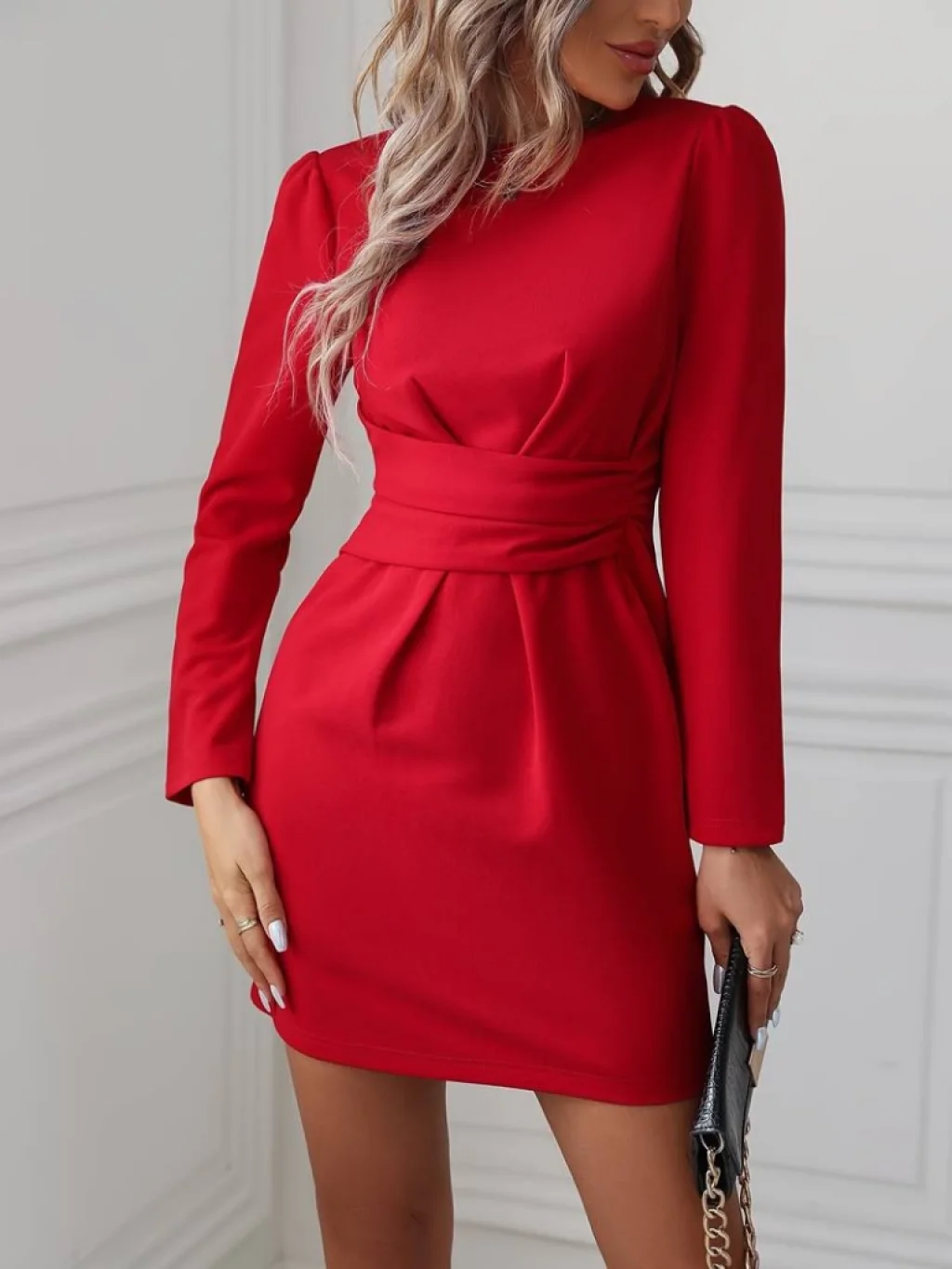 Kadın Uzun Kollu Yuvarlak Yaka Pileli Salaş Mini Ithal Krep Elbise