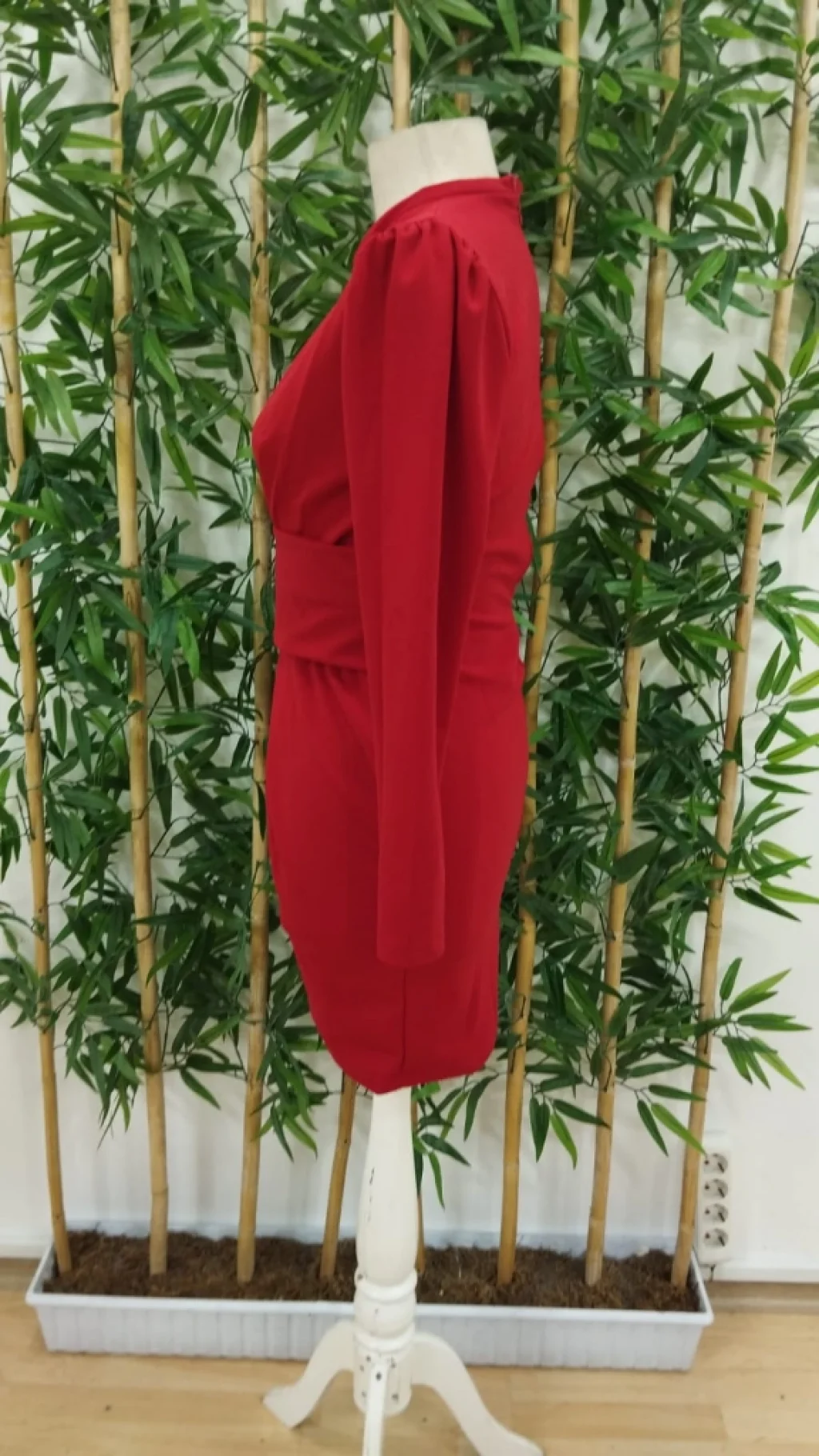 Kadın Uzun Kollu Göğüs Dekolteli Kadife Kumaş Mini Kruvaze Elbise