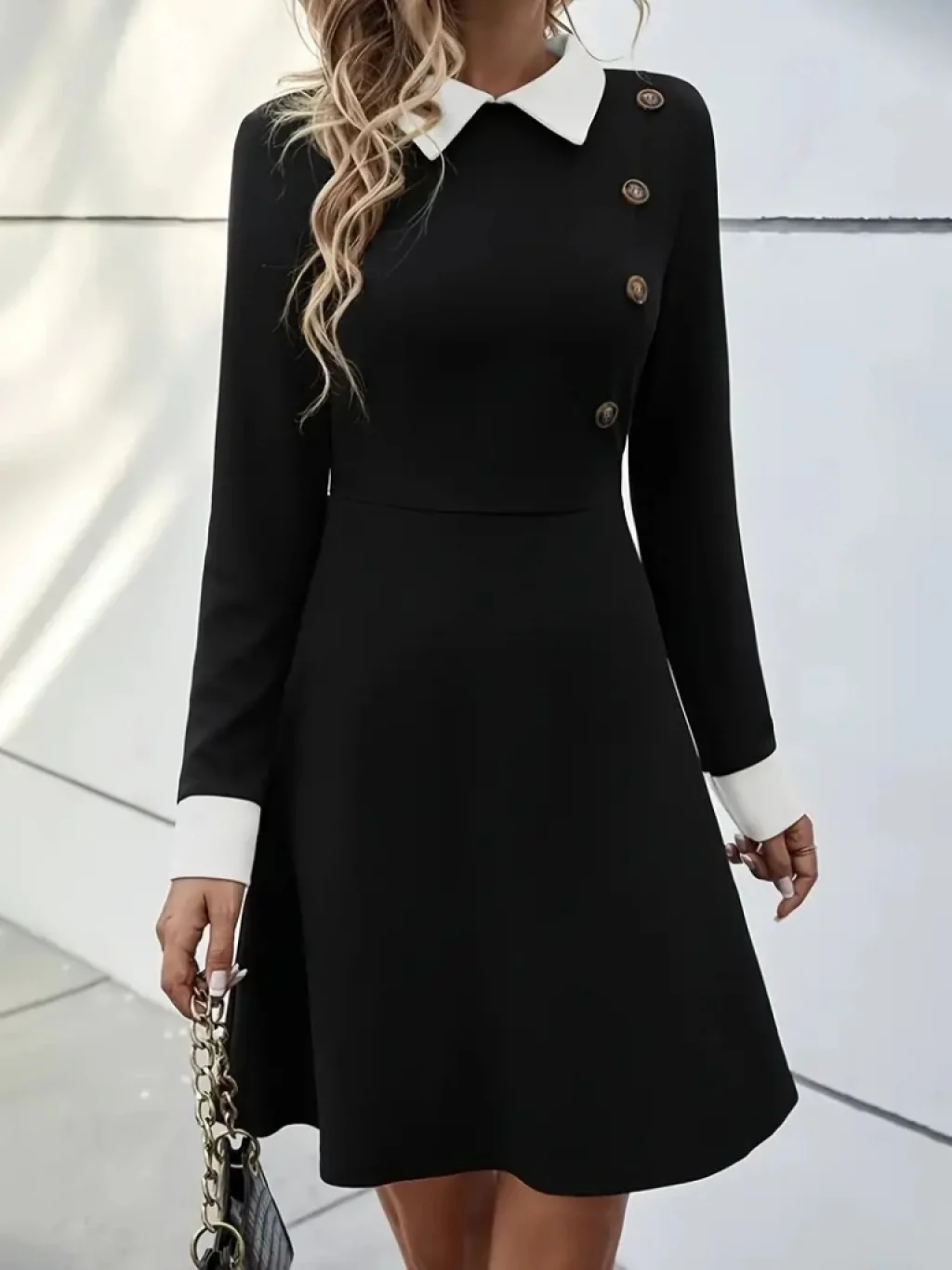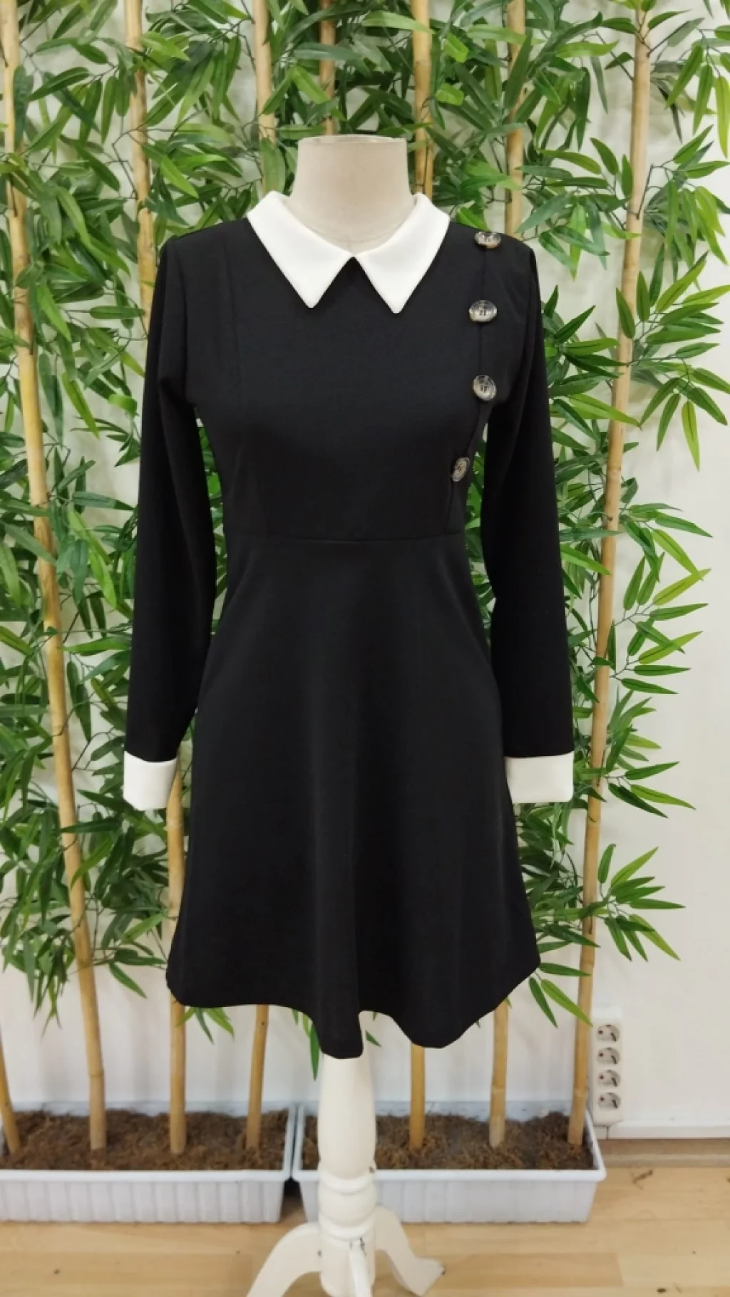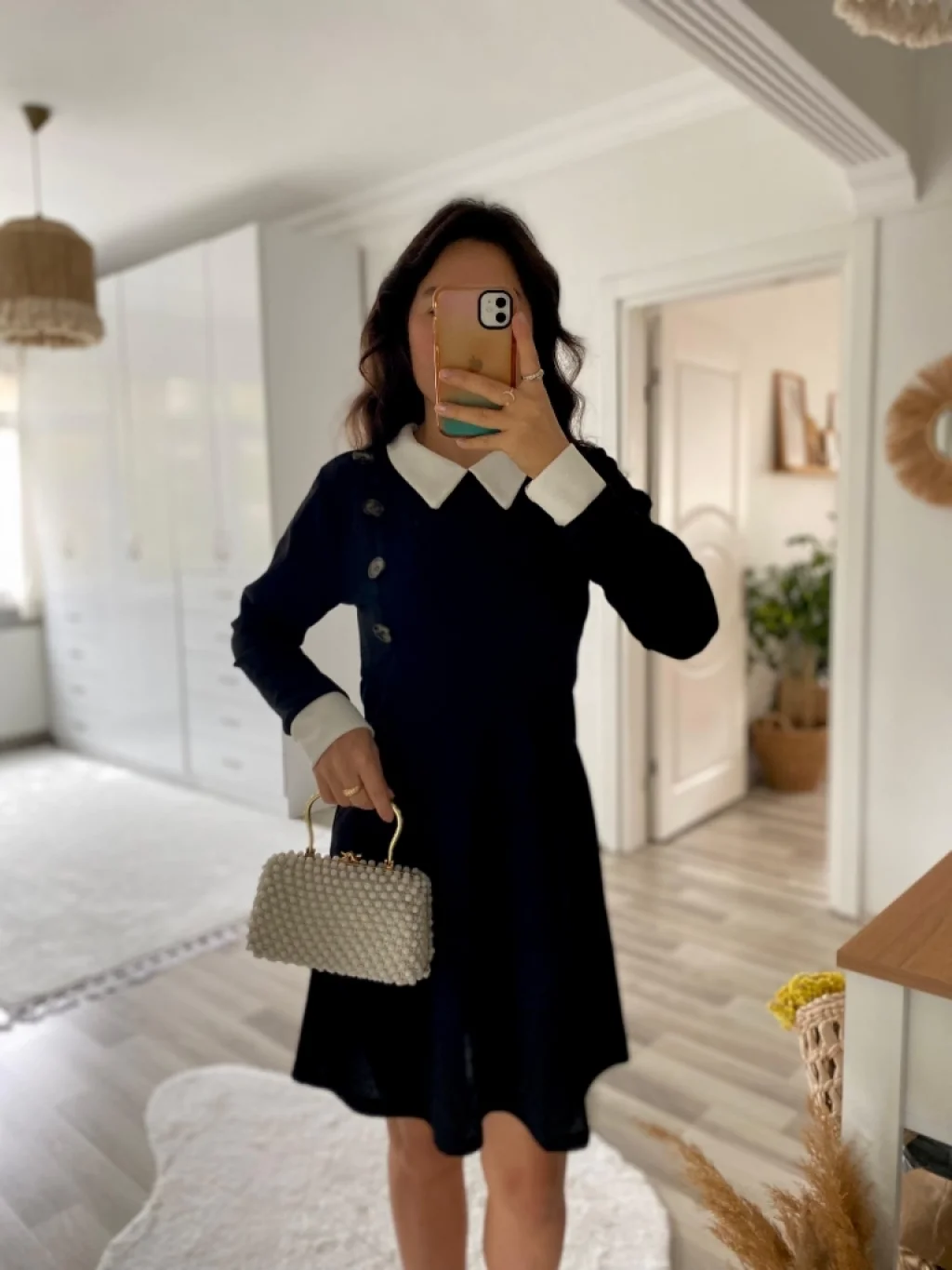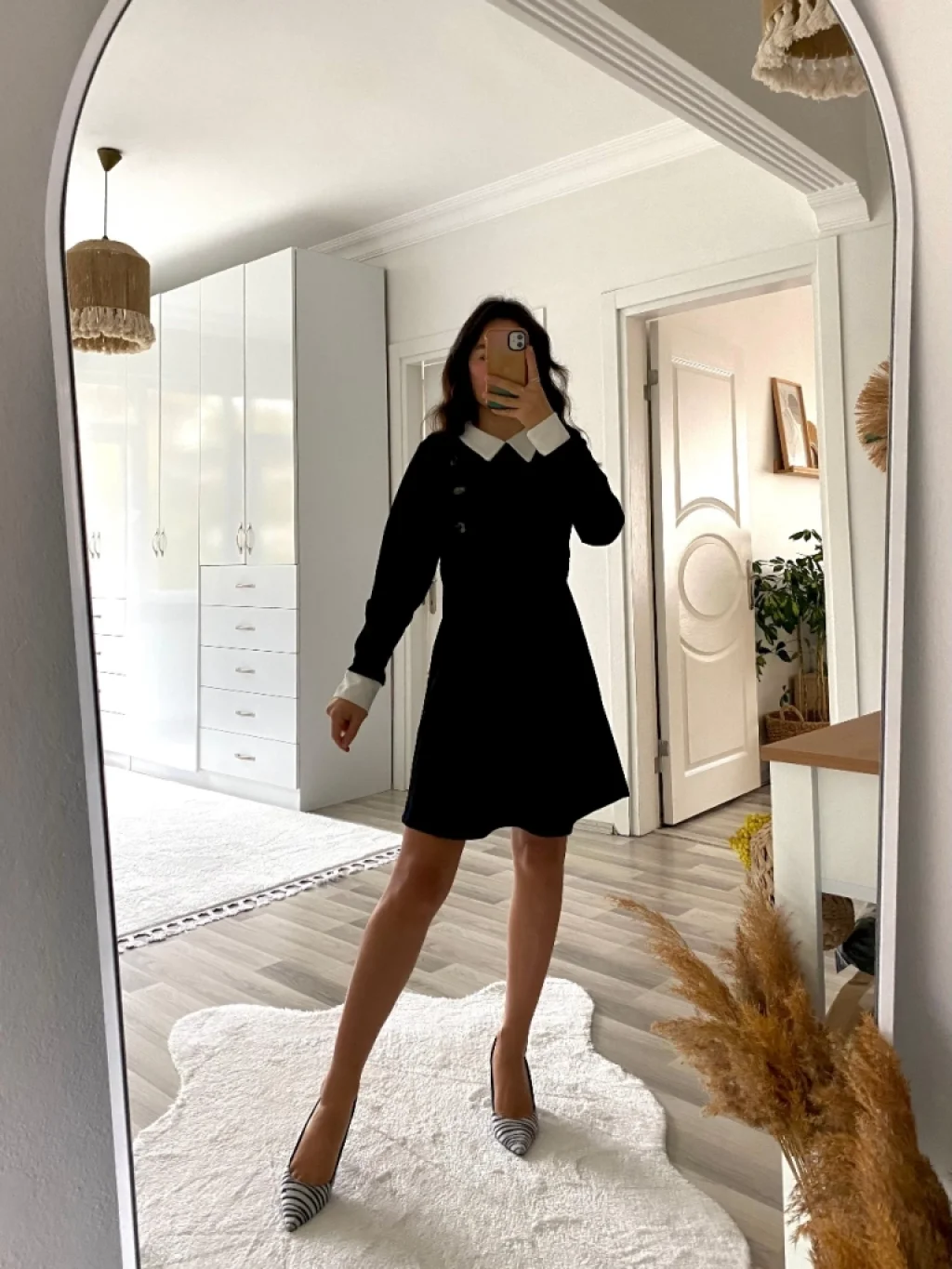 Kadın Uzun Kollu Yakalı A Kesim Kısa Ithal Krep Elbise