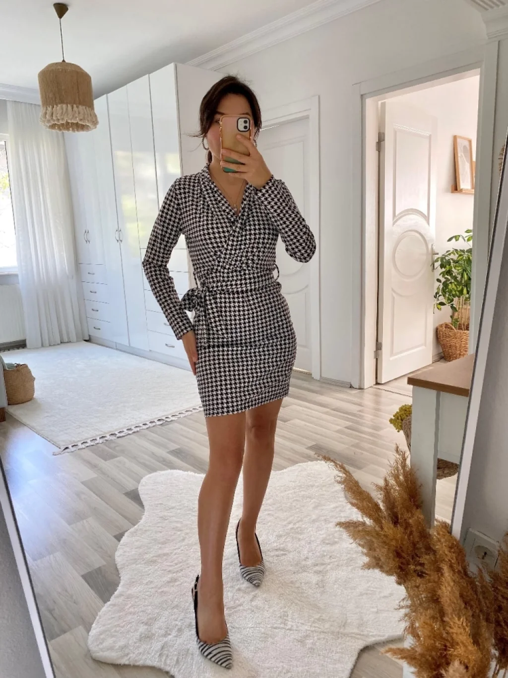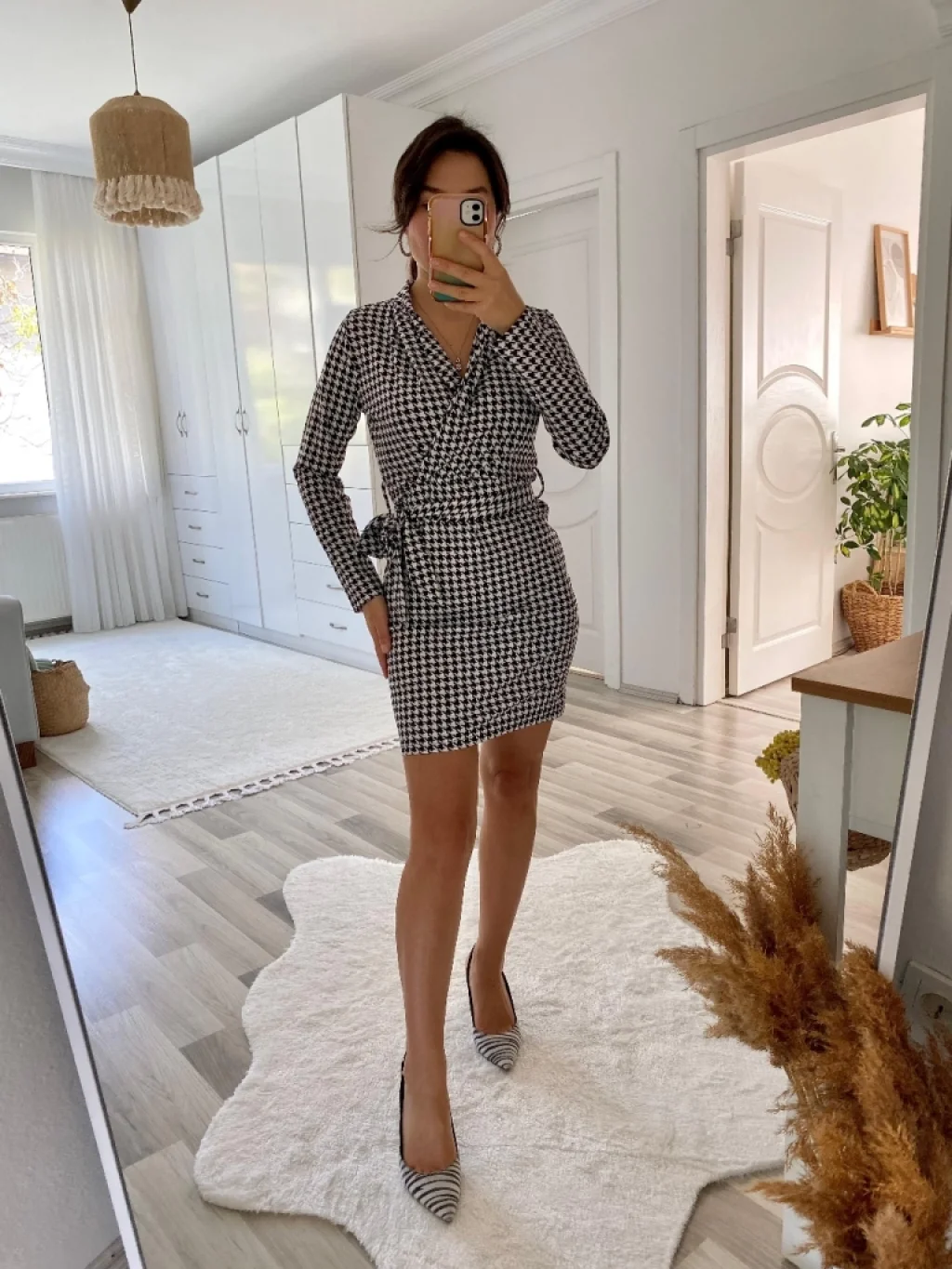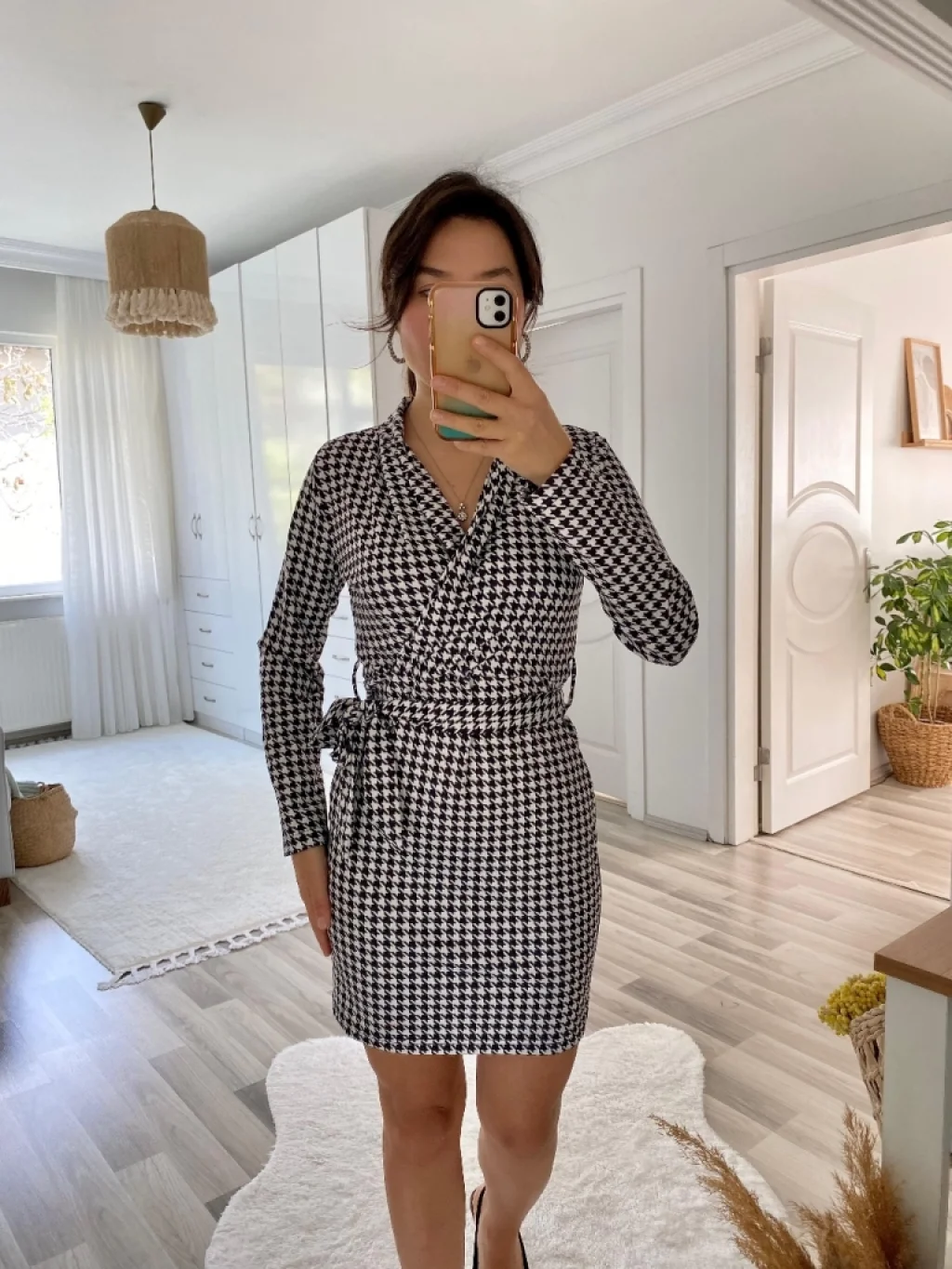 <p>Kadın Uzun Kollu Kruvaze Yaka Bağlamalı Kemer Dalgıç Mini Boy Elbise</p><br> <p>Modelin Ölçüleri: Boy:165, Kg:55, Göğüs:90, Bel:72, Kalça: 100</p><br> <p>Modelin üzerindeki ürün M/38 bedendir</p><br> <ul> <li>EK OZELLIKLER-Boş/Ek özellik Yok</li><li>KAPATMA TURU-Diger</li><li>TARZ-Diger</li><li>YAKA-Kruvaze</li><li>UZUNLUK-Mini</li><li>DESEN-Kazayağı</li><li>KOL UZUNLUK-Uzun Kol</li><li>TARZ-Gündelik</li><li>KALIP-Diger</li> </ul>